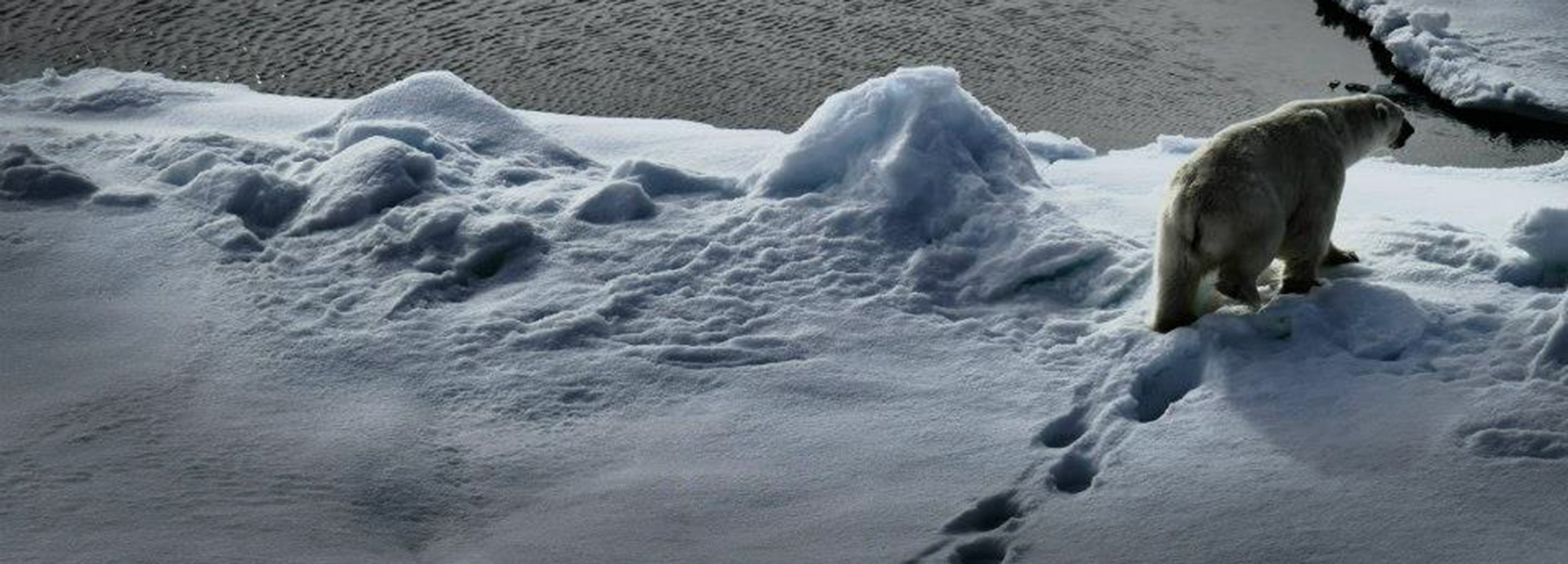 A polar bear wandering over a snow drift, leaving a trail of deep footprints.