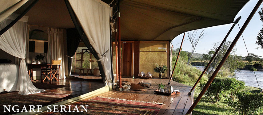 Ngare is a snug little camp that hugs the banks of the Mara River. It can only be reached on foot over a narrow rope bridge and is a cosy, intimate place to detach yourself from the modern world. It consists of only four tents and this makes it perfect for hosting a family holiday or gathering a group of friends. The tents are dotted along the riverbank, decked out in style with Zanzibar fourposter beds and open bathrooms overlooking pools filled with pods of hippo – the perfect spot for lounging languidly, soaking up the sights and sounds of the bush from the bathtub built into your veranda decking.