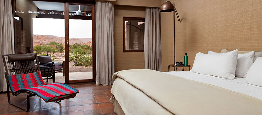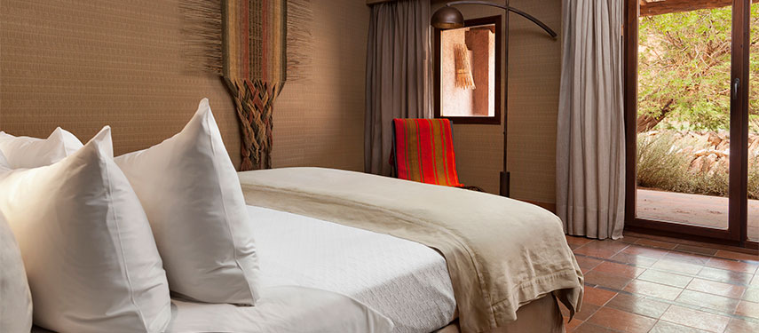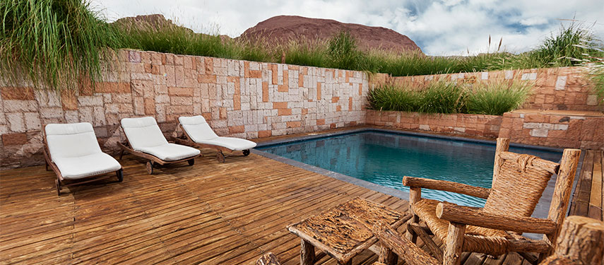 Built in the style of traditional adobe, the lodge is a stunning example of innovative and sustainable architecture, blending seamlessly into the surrounding red rock hillside. There are even llamas grazing about. The understated luxury of the public spaces and the 42 rooms pay homage to the Atacama region with splashes of warm, desert colours and local textiles, crafts and lots of stone. Each of the rooms boasts private terraces with incredible views.