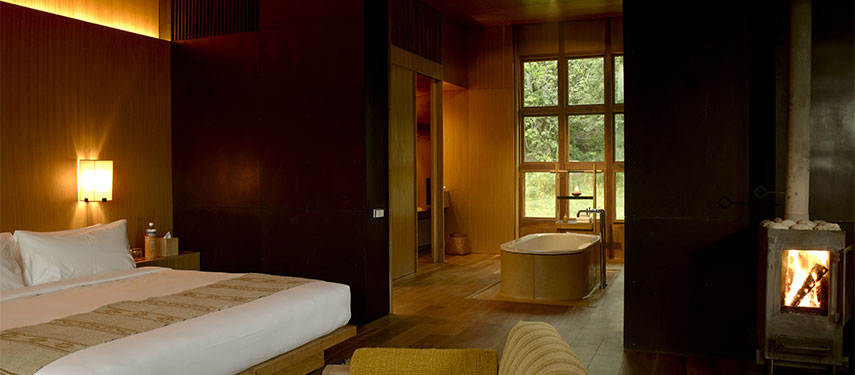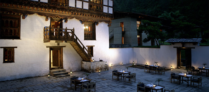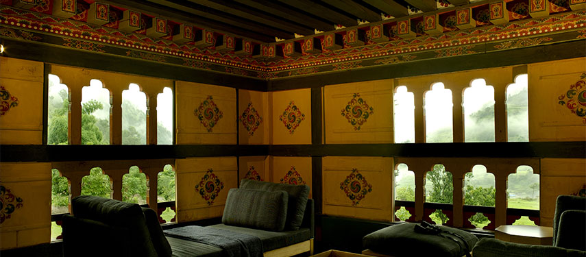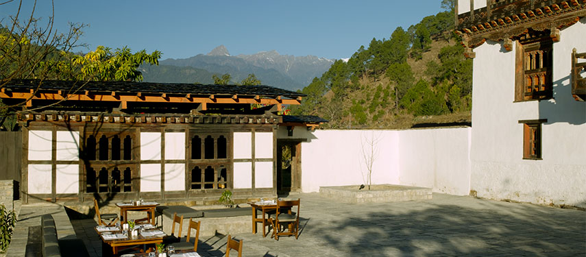 The lodge itself includes a traditional Bhutanese farmhouse built as a residence by a previous Je Kempo (spiritual and religious leader). This grand structure, with its preserved vegetable dye wall paintings, houses the dining room and intimate relaxation areas as well as a traditional altar room for meditation. The courtyard is suitable for outdoor dining and relaxation in Punakha’s temperate climate.