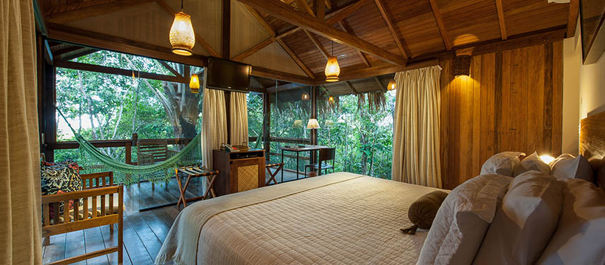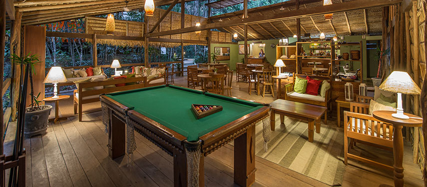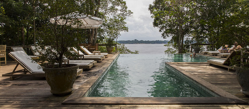 Activities are included and depending on your length of stay you may enjoy hikes in the jungle, piranha fishing, dolphin & alligator spotting, canoe trips, and visits to local indigenous communities. The lodge also offers experienced guides fluent in English, Portuguese, and Spanish, as well as transportation to and from the international airport in Manaus. When not participating in the Lodge’s activities, you can relax around the lush swimming pool or enjoy a drink at the bar, which also offers a library, games and comfortable chairs.
