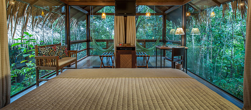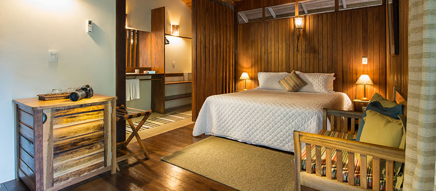 The Anavilhanas Jungle Lodge’s 20 guestrooms are built on suspended wooden structures, and arranged in combined cottages or individual bungalows, offering a combination simplicity and comfort. Adorned with regional handicrafts, every room provides air conditioning, private bathrooms with hot showers and private deck. All meals are included and the restaurant serves a variety of Amazonian flavours and international cuisine.