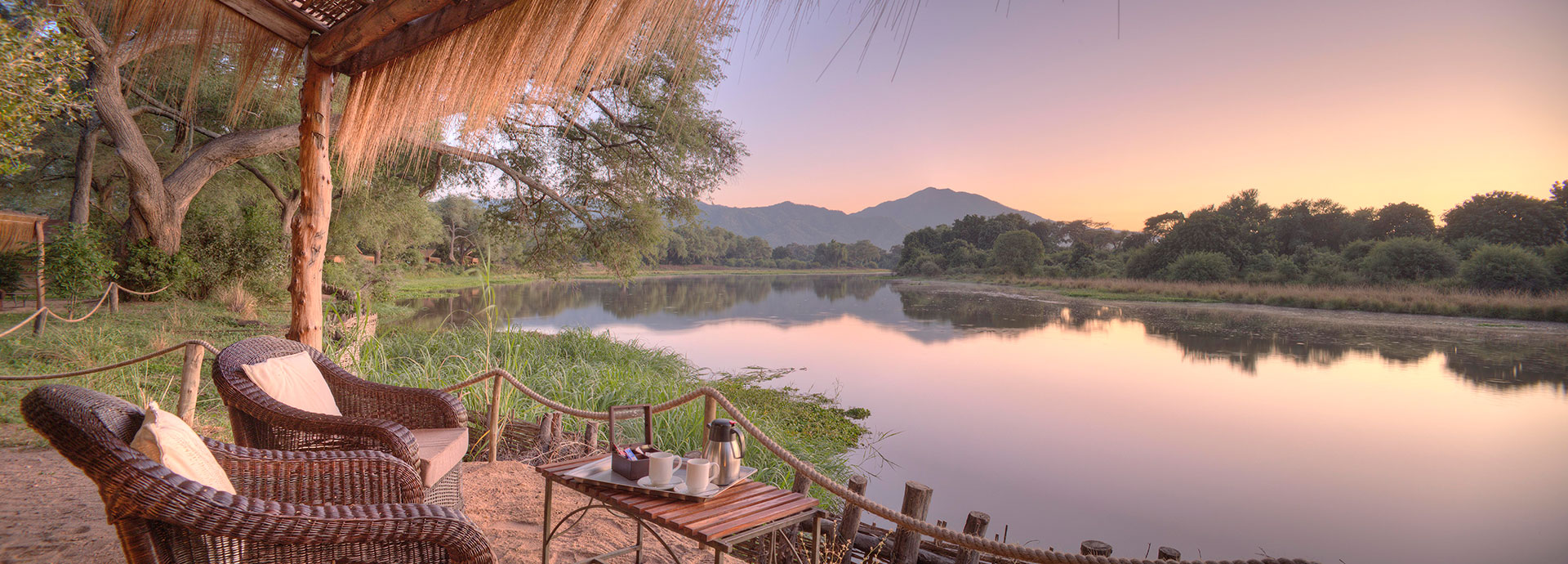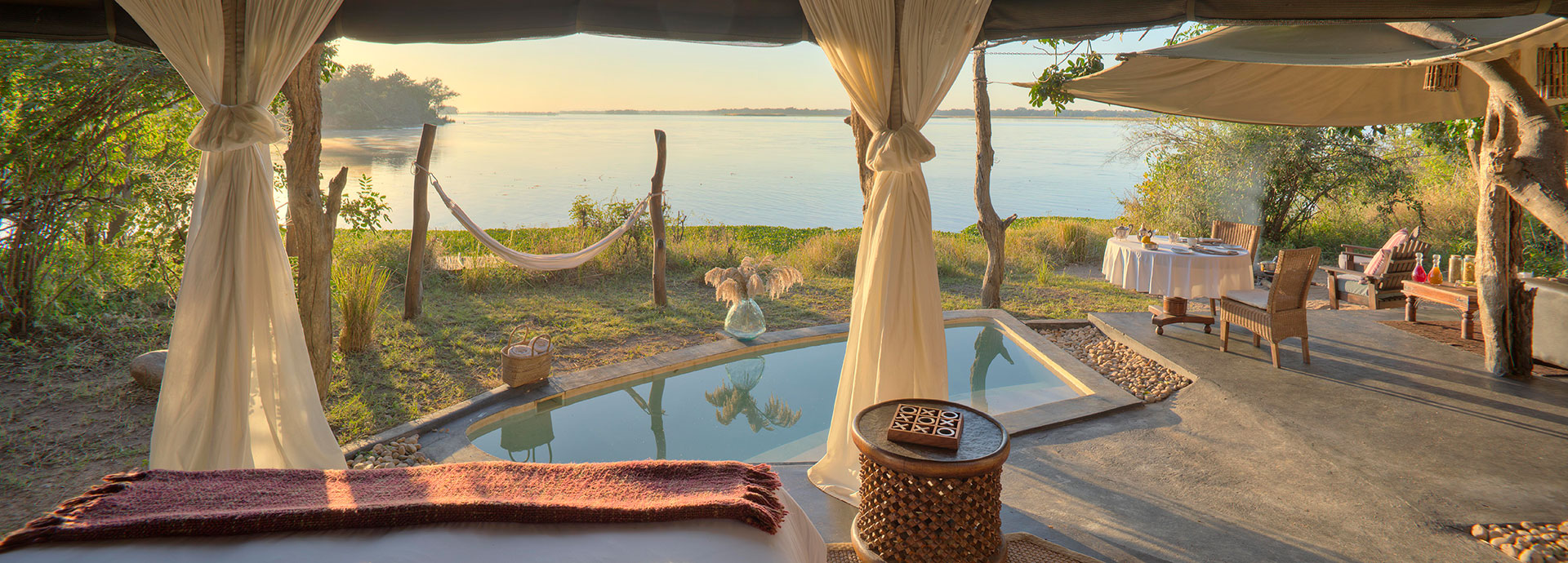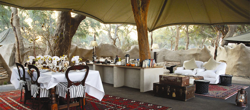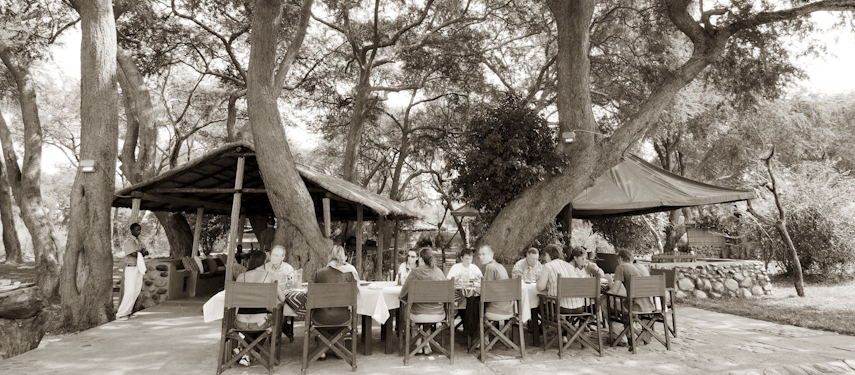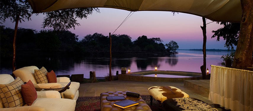 Chongwe River Camp is situated on the confluence of the Chongwe and Zambezi Rivers, directly opposite Zimbabwe’s Mana Pools. The Chongwe River is the boundary of the Lower Zambezi National Park. The camp itself looks onto the confluence of the Chongwe and Zambezi rivers and the mountains of the escarpment to the north.  The chalets are large, well-appointed Mulati tents under thatch, each with a luxury open-air bathroom.  Situated under a canopy of Albida thorns and surrounded by cool lawns, they command fabulous views over the Rivers.  The bathrooms are an experience on their own, open air with fittings made from natural materials found near the lodge.