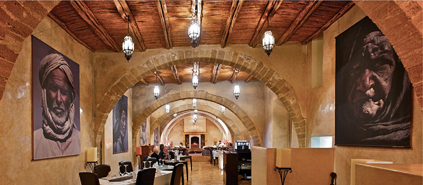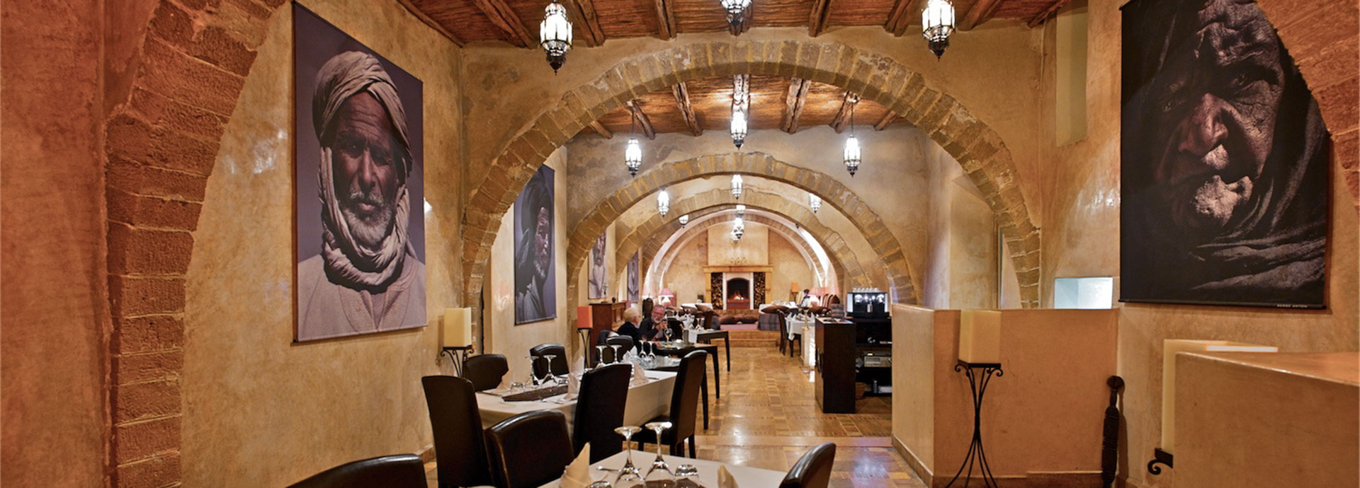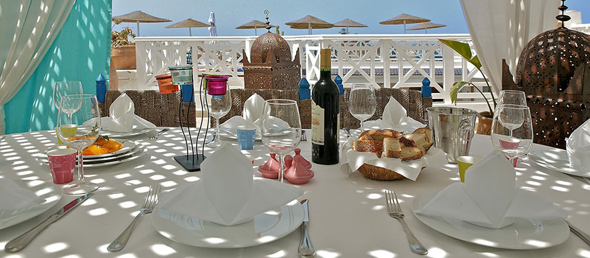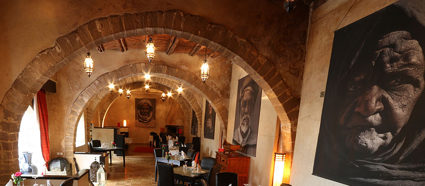 The restaurant offers a delightful blend of tastes and spices and on the menu you will find great European and Moroccan classics along with experimental dishes born from the fusion of Moroccan cuisine with various flavors of the world. Local natural products like argan and olive oil and a selection of regional cheeses are emphasized. You may also choose to dine at tables set out in the inner courtyard or on the terrace, while indulging yourself in a beautiful, colorful African sunset. Even though the riad has been fashioned into a spacious, stylish boutique hotel it maintains a simple and natural atmosphere and is the perfect base for exploring the coastal town of Essaouira.
