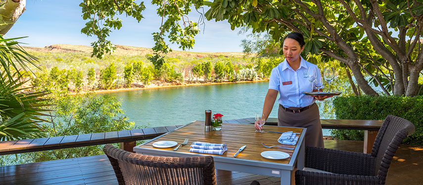 The Homestead at El Questro is an exclusive retreat situated atop the Chamberlain Gorge with stunning views across the rugged landscape. Nine exclusive suites accommodate just eighteen guests ensuring that service is attentive, yet relaxed. The suites are all cosy and comfortable but vary in style from the modern cliffside retreats to the more traditional homestead rooms. Some have wrap around verandas and outdoor bathrooms set in private walled gardens while others are cantilevered over the tranquil Chamberlain River to provide breathtaking views. Surrounded by lush tropical gardens, the Homestead has a swimming pool and tennis court for the exclusive use of its guests. A modern Australian menu is served on a sweeping veranda – the perfect place to drink in the landscape as it turns orange and pink at sunset.