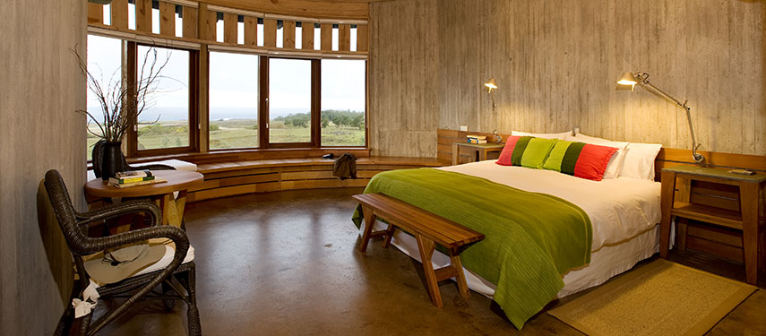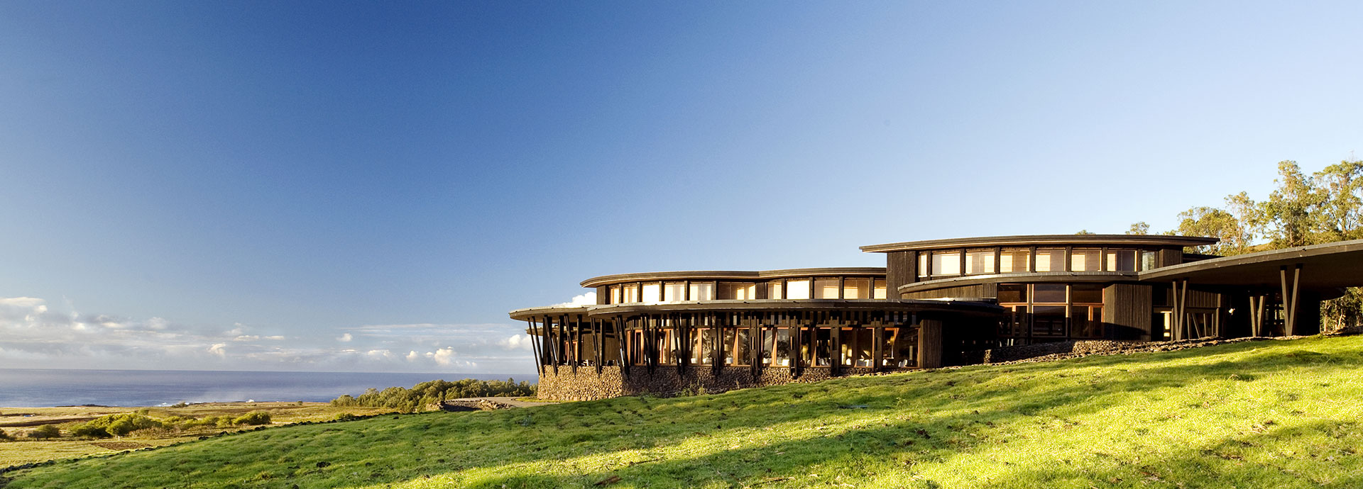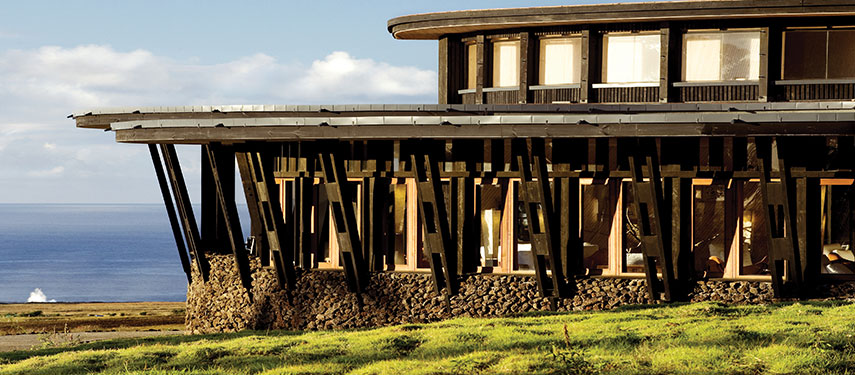 Explora Rapa Nui is the most sought after property for travellers to Easter Island, a land whose origins and evolution remain unexplained. The lodge was the first in South America to obtain LEED (Leadership in Energy and Environmental Design) certification from the United States Green Building Council. All of the rooms, which extend to the north and south from a central building, have excellent ocean views. The lodge has welcoming indoor spaces which integrate aspects of the local culture. The design is intended to have minimal impact on its surroundings, and the lodge is built on a site which is inappropriate for agricultural use and has no archaeological remains. The flora surrounding it has been maintained intact. The rooms of this all-inclusive hotel spread out from the central area housing the reception, living areas, bar, and kitchen. Next to the common areas is the Casa de Baños Hare Vai spa, with a pool, massage facility and open-air Jacuzzis. Explora Rapa Nui was constructed using volcanic rock and wood from the island.