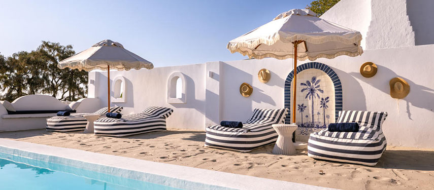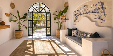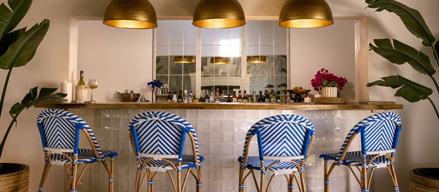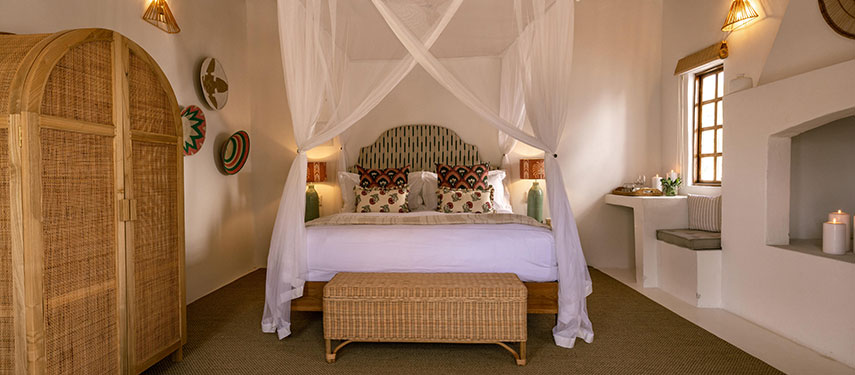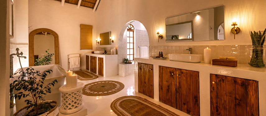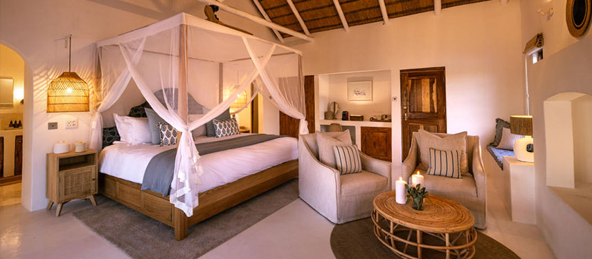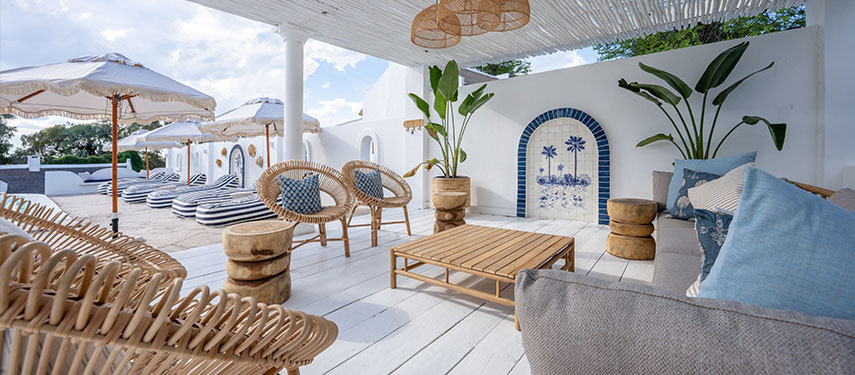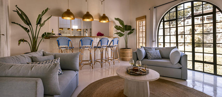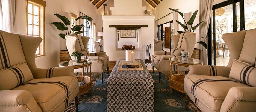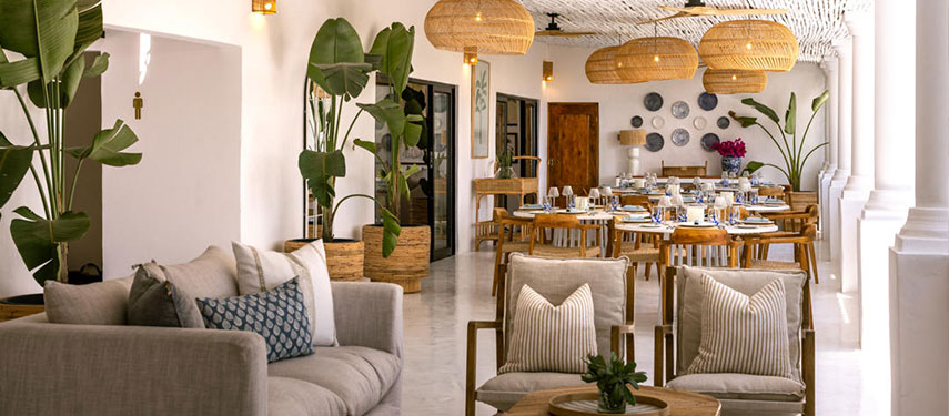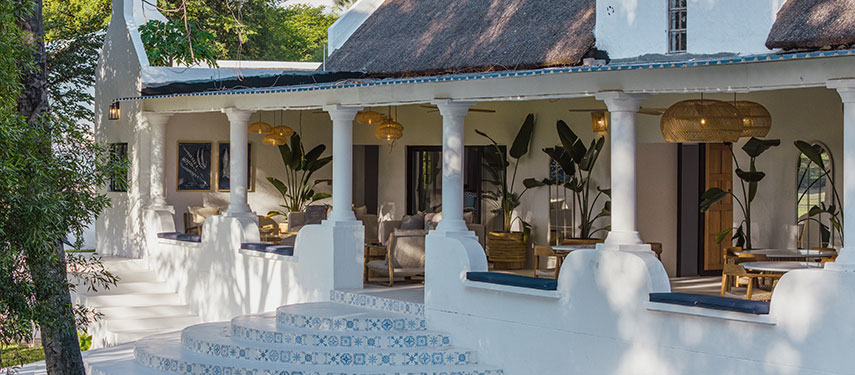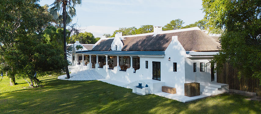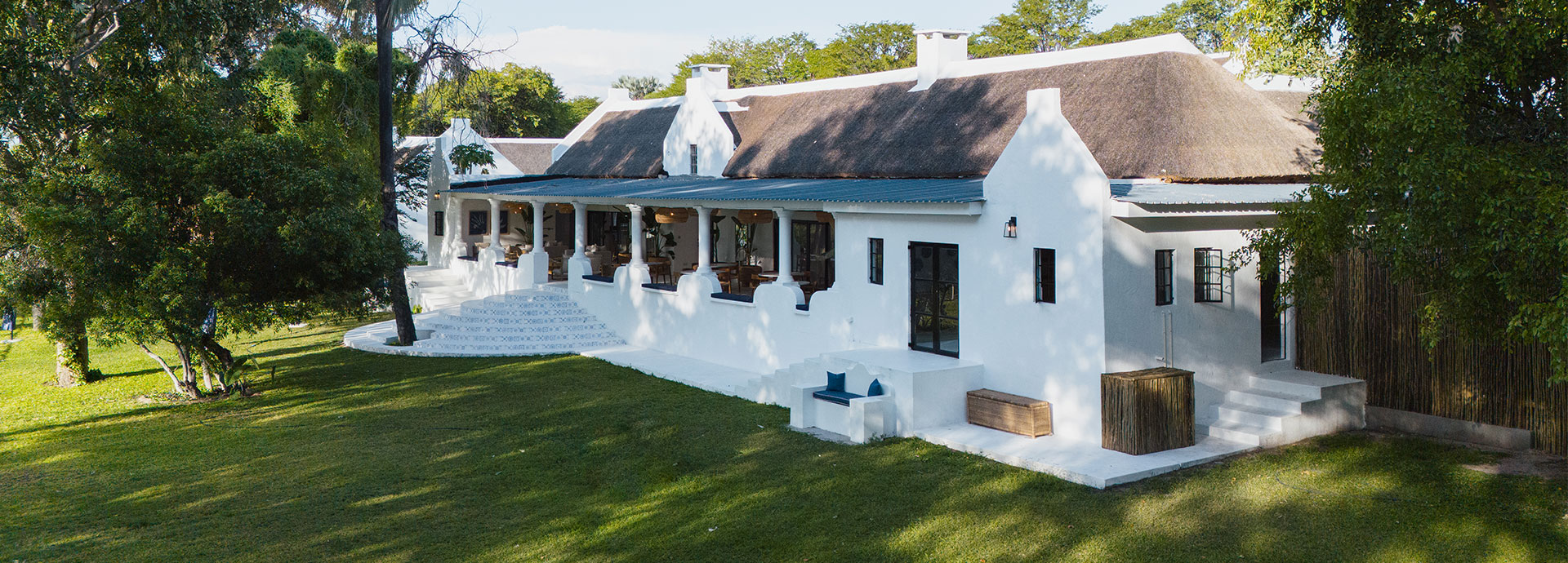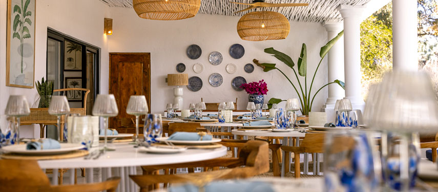 Featuring thatched, high ceilings and tall archways, the hotel welcomes plenty of natural light and is infused with a sense of tranquility and space. Modern, minimalist interiors with a light blue, white and natural palette are accentuated by large, generous verandahs overlooking grassy lawns with dappled shade from leadwood and raintrees.