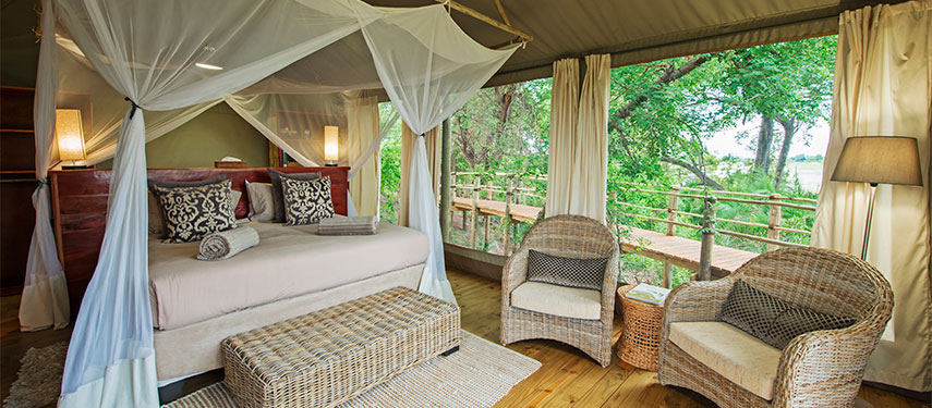 Accommodation is in five Meru-style en-suite tents built on raised wooden decks which offer panoramic views of the Okavango Delta. The main dining area is on an elevated platform between two magnificent sycamore trees, and surrounded by dense wild date palms. Downstairs, there is a cozy lounge with an area for an open fire under the stars and a plunge pool for cooling off in the midday sun.
