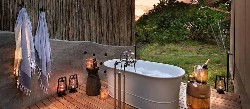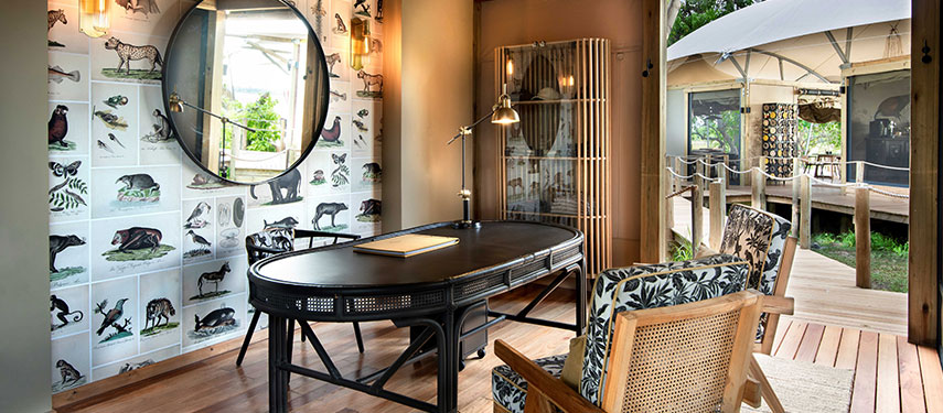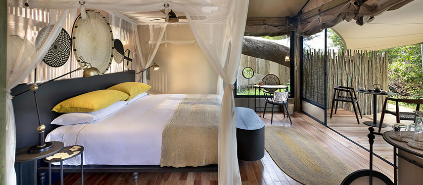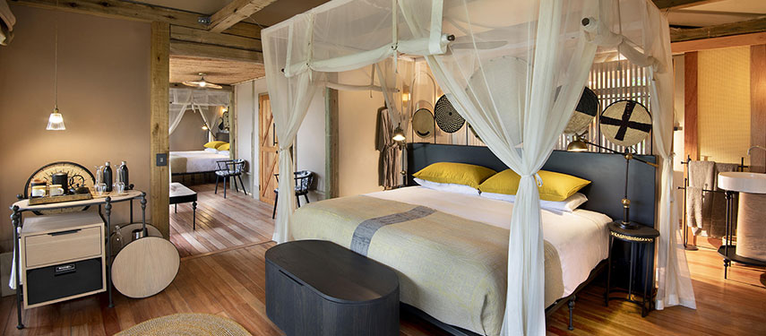 Khwai Leadwood offers six luxury tented suites, one family tented suite, and one luxury honeymoon tented suite, each with a private viewing deck for optimal views of the African bush. The family suite includes interconnecting bedrooms, thoughtfully designed to provide both privacy and convenience. All suites are elegantly furnished with king-size beds, mosquito netting, and include indoor and outdoor showers, along with a fully stocked mini bar. For a romantic getaway, the luxury honeymoon suite includes an outdoor bath, perfect for soaking under the stars while enjoying the soothing sounds of the African bush. The main lodge offers a welcoming lounge, dining area, reading nook and pool, all with seren, sweeping views of the river. End your evening by the firepit, where you can relax under the starlit sky and savor the warmth of the fire.
