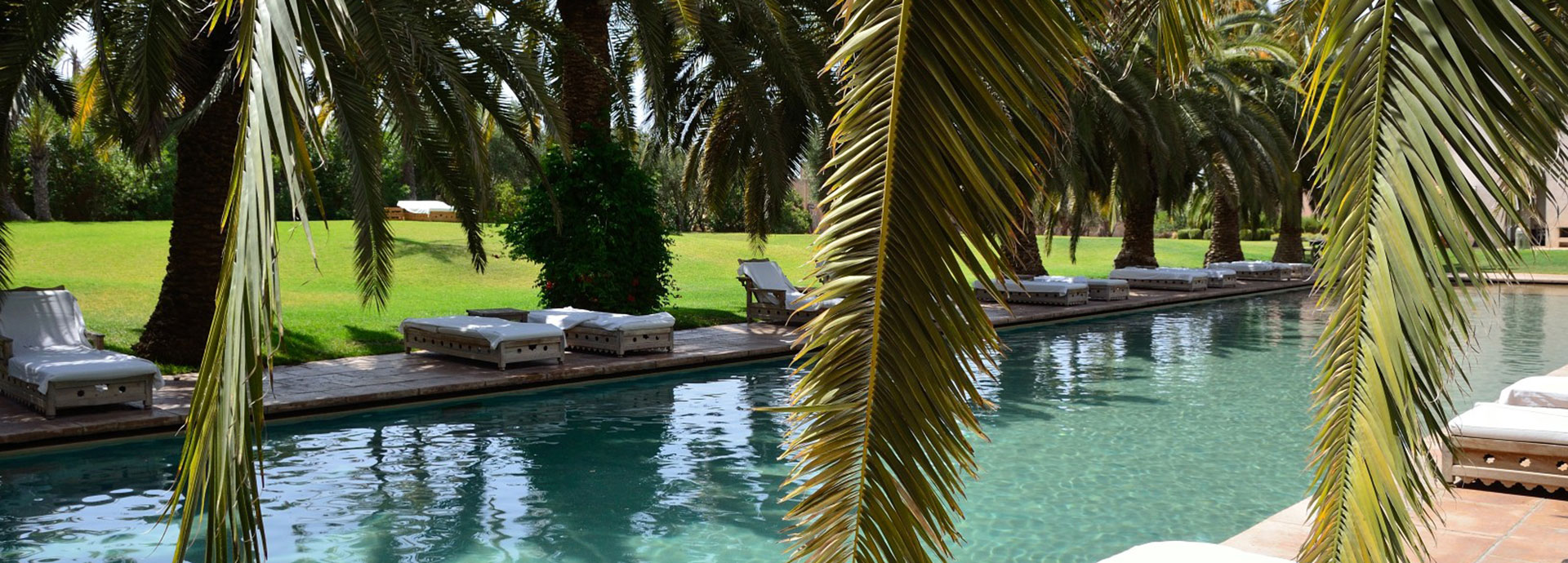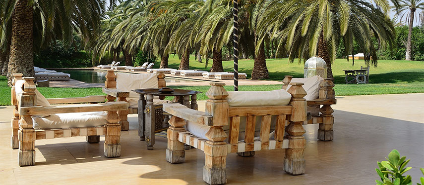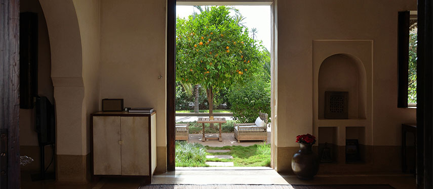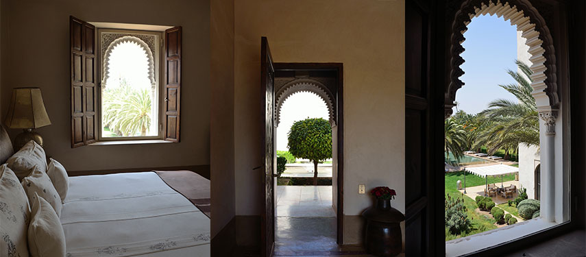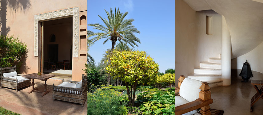 Nestling in a palm grove just 20 minutes outside bustling Marrakech, and with a backdrop of the Atlas Mountains, is a Moorish-style palace, Ksar Char-Bagh.