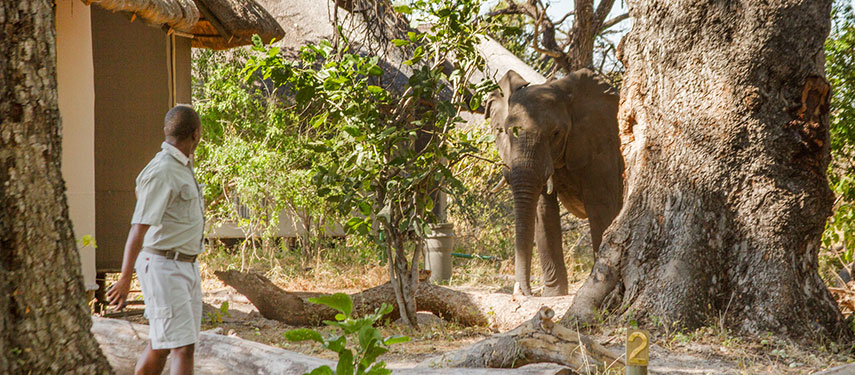 Seasonally large herds of elephant drink at the river bank near to the camp in full view of the main deck, while playful spotted – necked otters are commonly seen performing in the water.