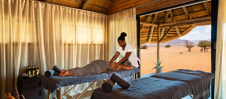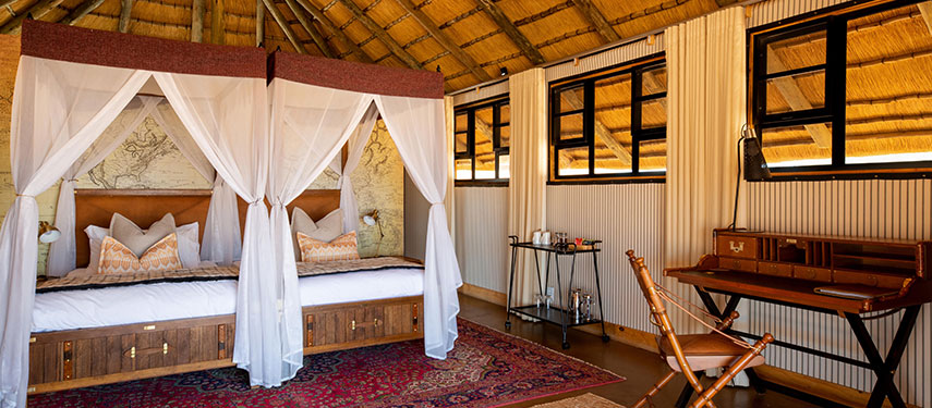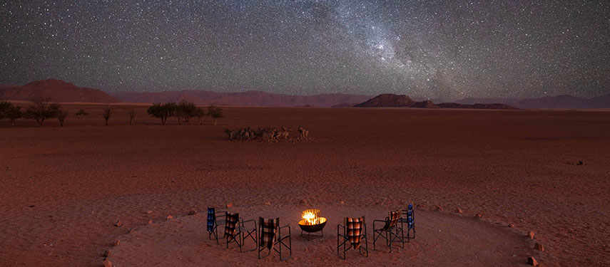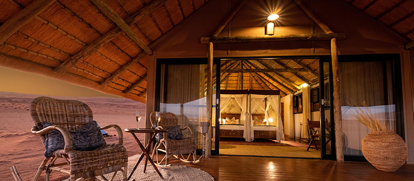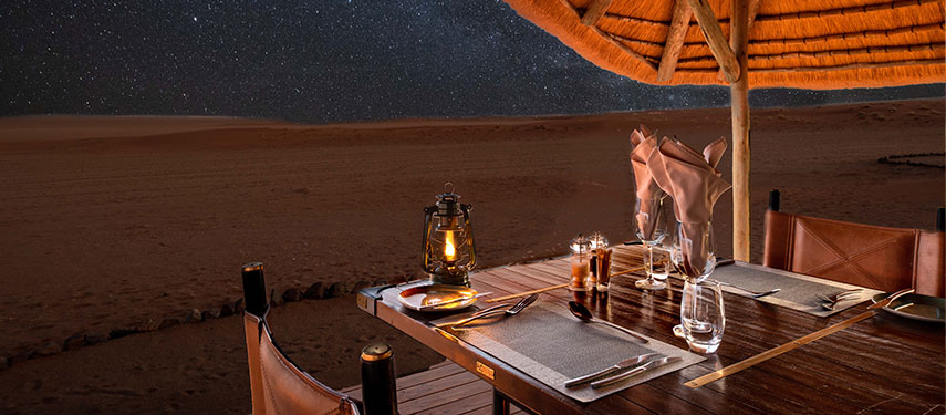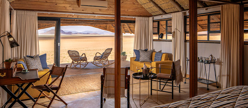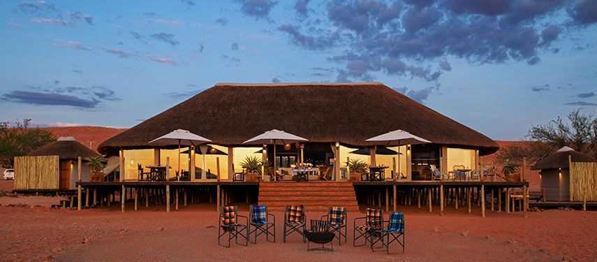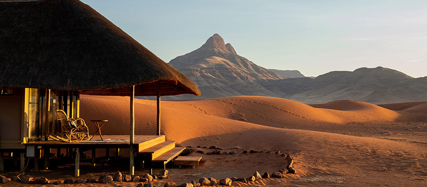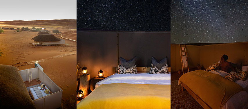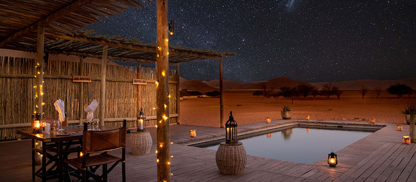 At Kwessi Dunes, you’ll find 12 cool and comfortable chalets, all with canvas walls and thatched roofs. Each bedroom has a separate ‘star gazer’ room, completely open to the sky—the perfect spot to watch the celestial theatre above. Views from the rooms, the main area, and the swimming pool stretch across the vast desert vistas. When you can bear to tear your eyes away, enjoy quad biking, scenic drives and walks, hot air ballooning, helicopter flights, horse riding, and day trips to Sossusvlei.