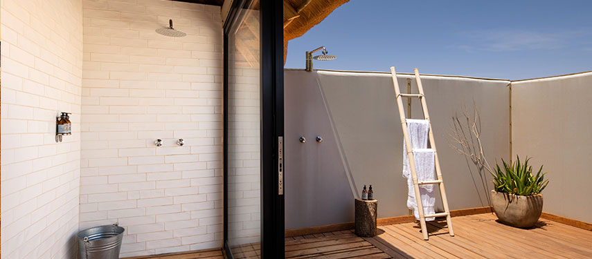 The view from the lodge is spectacular, and the glass windows and doors in the main area look out onto undulating sand that only ends where it meets the mountains, far in the distance. Inside, there’s a well-stocked bar, a library area, and several seating and dining spaces. As the sun rises, head to the campfire for a morning cuppa, and when the heat of the day sets in, the swimming pool is the only place to be.