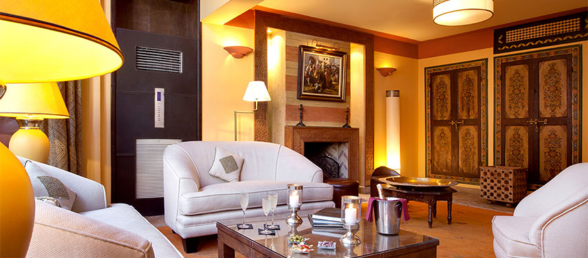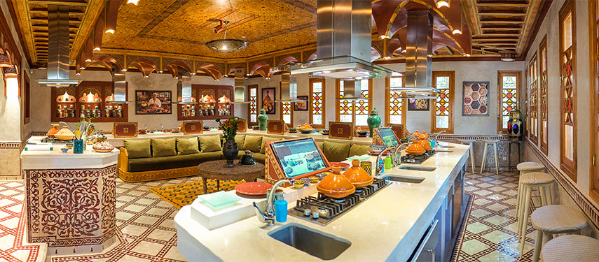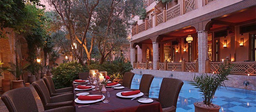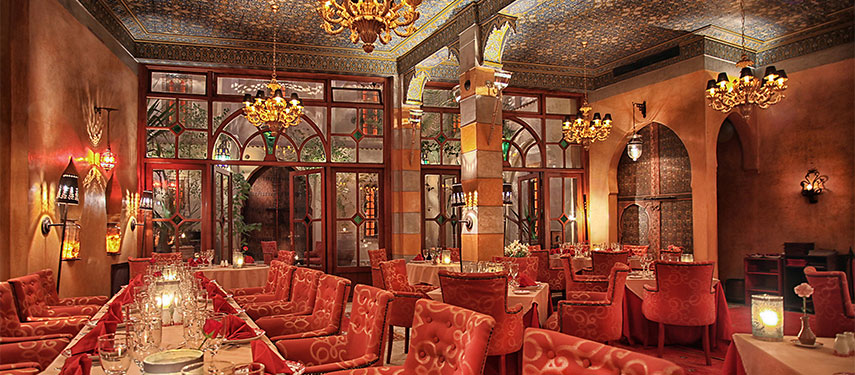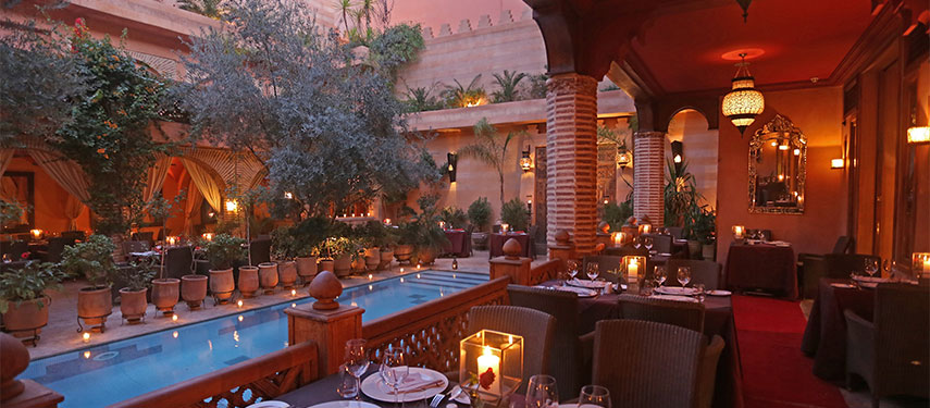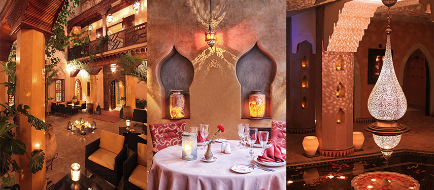 Fine dining is offered at Le Restaurant, where you can sample an exclusive Moroccan menu accompanied by Arab-Andalucian music, or dine outside on the patio listening to the trickling fountains. Enter Les Trois Saveurs, lit by teardrop-shaped lanterns, and enjoy French, Moroccan and Asian cuisine inside or alfresco on the poolside terrace. The 1930s-style Piano-Jazz Bar offers pre and post-dinner drinks and there is a swimming pool surrounded by olive trees and roses, and a sublime spa offering traditional hammam.