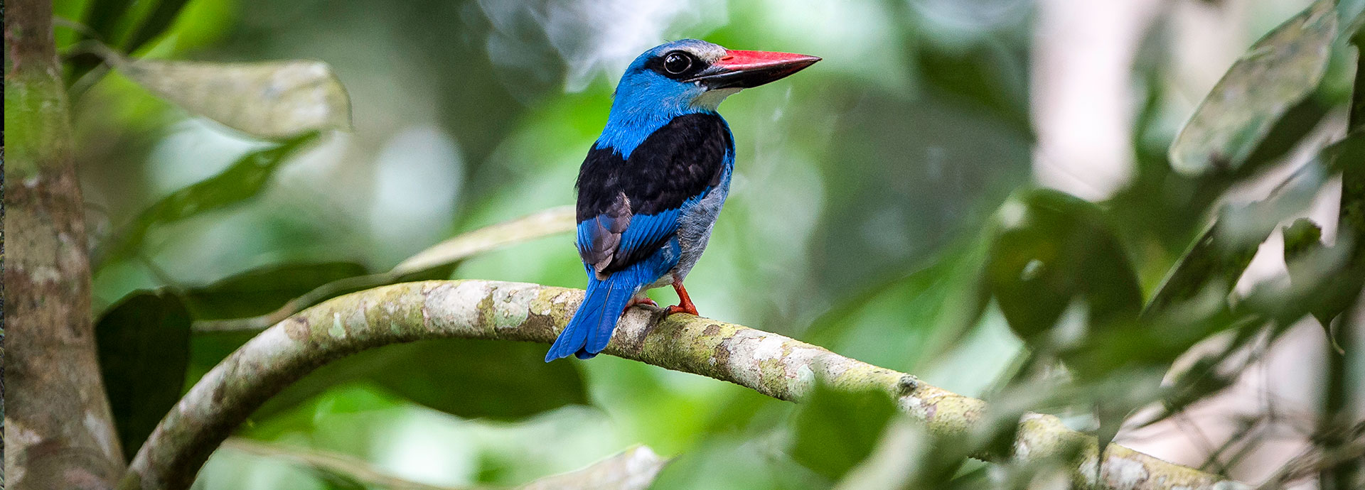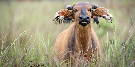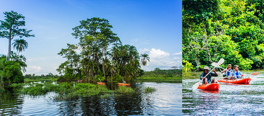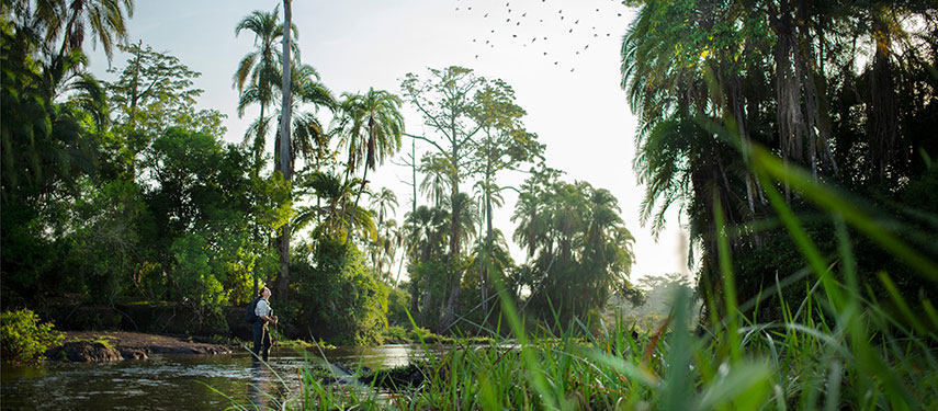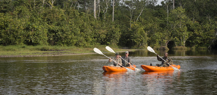 Excursions from Lango are designed to showcase a wide variety of habitats, wildlife, and experiences for full immersion in the richness of the rainforest. Activities include walking and boating—combined with some game drives—in search of forest species such as forest buffalo, forest elephant, sitatunga, and harnessed bushbuck, as well as primates like guereza colobus, grey-cheeked mangabey, and putty-nosed monkey.