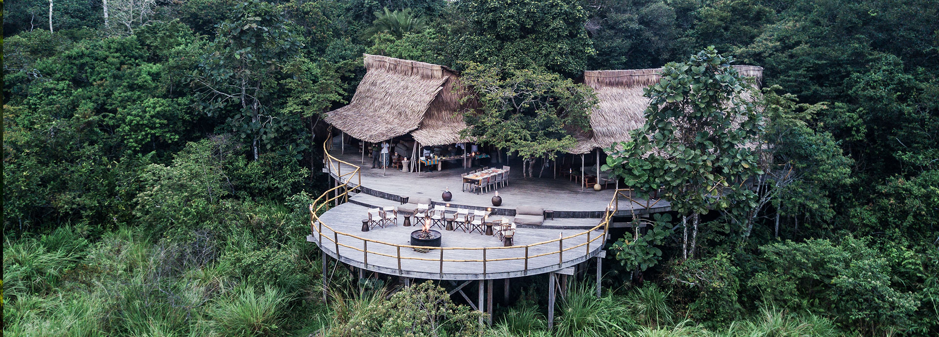 Each of the six creatively designed guest rooms is inspired by the traditional architecture of the local B’Aka Pygmy communities. Elevated three to four metres above the ground, they offer views over part of the bai and the surrounding gallery forest. Floating wooden walkways connect the rooms to the central lodge area, which is built using natural, locally sourced materials such as sustainably harvested timber, bamboo, and raffia palm thatch woven by local communities. A sunken deck with a star-gazing platform and fire pit overlooks the bai—an ideal spot for after-dinner relaxation.