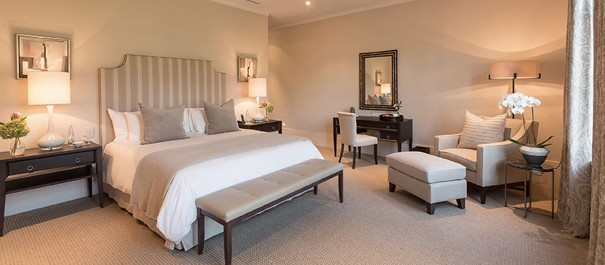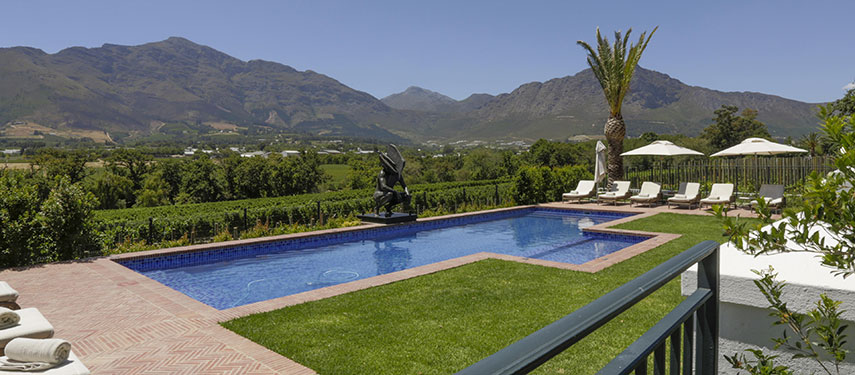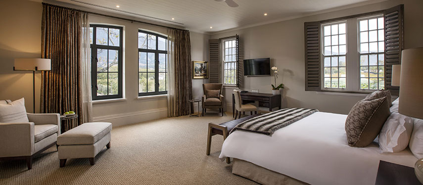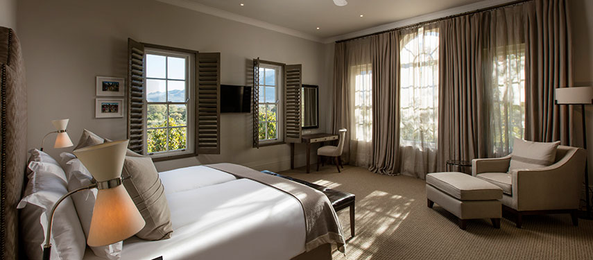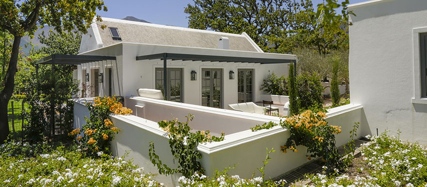 The seventeen rooms are relaxed and sophisticated, styled in leather, natural timber and marble. Classic rooms sit within The Manor House and Max House while deluxe rooms occupy the Cellar Cottage and Vineyard Cottage. All offer luxury linens, rain showers, nespresso machines and a range of beautiful views across manicured gardens, plum orchards, vineyards, Franschhoek village and the mountains beyond.