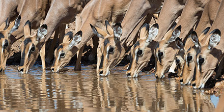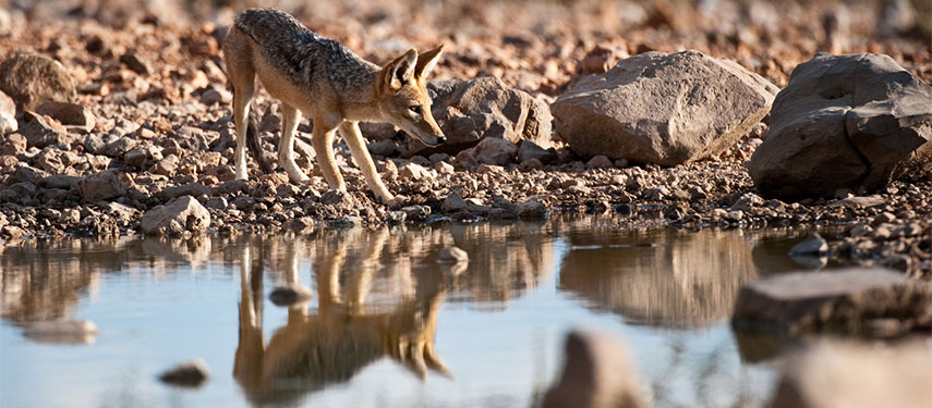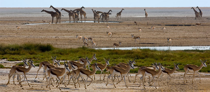 Africa’s largest saltpan, Etosha, is the result of a geological shift that dramatically changed the course of the Kunene River. The pans, 120 km across and 55 km from north to south, were formerly an ancient lake. Today the Pan is mostly bone dry, the stark, parched white surface giving the Pan its Herero name ‘Great White Place’. The edges of the Pan give way to a surprising variety of vegetation types; from woodland and broad swathes of mopane, to open acacia-strewn plains and grasslands. Fringing the pan are a number of productive waterholes that sustain the high density of large mammal fauna, from elephant, rhino and lion to vast herds of springbok, wildebeest, zebra, giraffe and gemsbok.