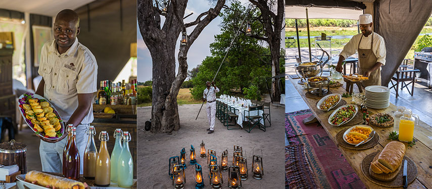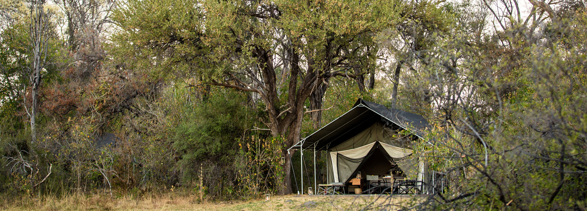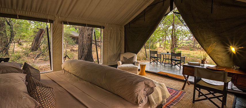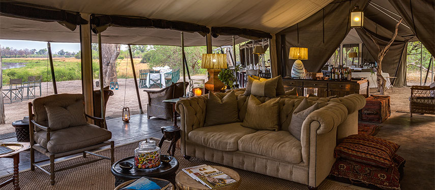 The camp is built in the classic 1950’s style, with ten luxury safari tents separated by pathways that meander between the large riverine trees. All of the tents are situated on the beautiful Khwai River, overlooking the famous Moremi Game Reserve. From their verandas you can watch the daily parade of animals coming down to drink at the river in front of camp. The communal mess area is spacious but provides plenty of quiet nooks in which to read or relax. Facilities include a plunge pool, dedicated wifi zone (wifi has deliberately not been installed throughout the camp), a curio shop and a library.