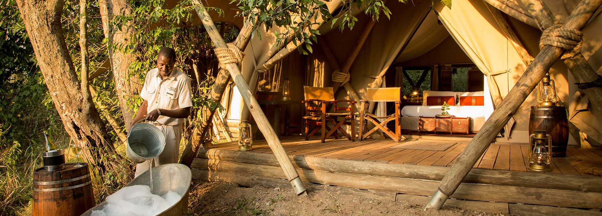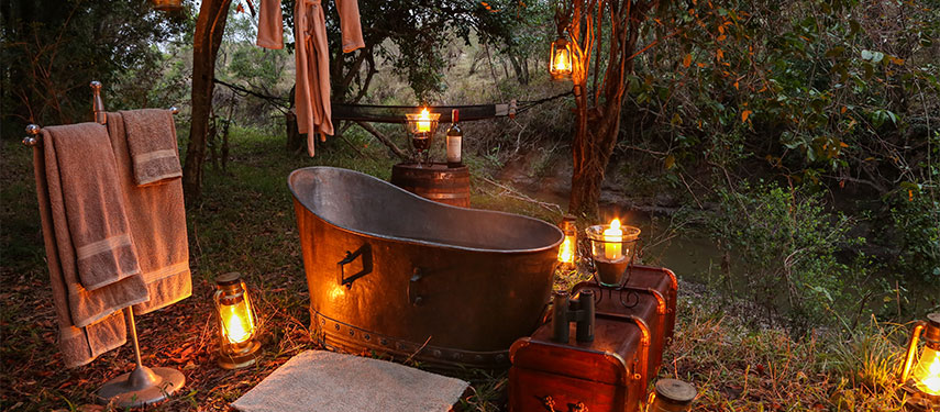 Set at ground level and shaded by the forest canopy, the camp’s five tents forego fancy amenities in favour of non-permanence and a light environmental footprint (see below) but in no way compromise on comfort being fully serviced with flushing toilets, bucket showers and hot-and-cold running water. There’s an air of yesteryear in Mara Expedition Camp’s design, and each tent is decorated with an eclectic yet co-ordinated assembly of what early explorers may have carried with them – brass chandeliers, old Indian campaign chests, soft leather and hardwood furniture – combined with rich textiles and crisp cotton linens