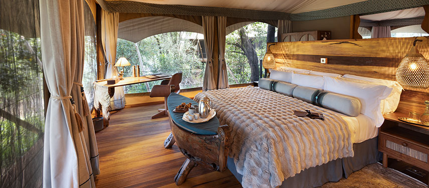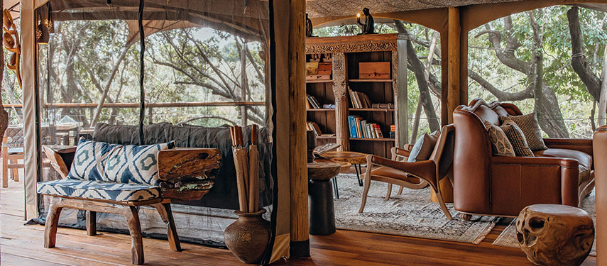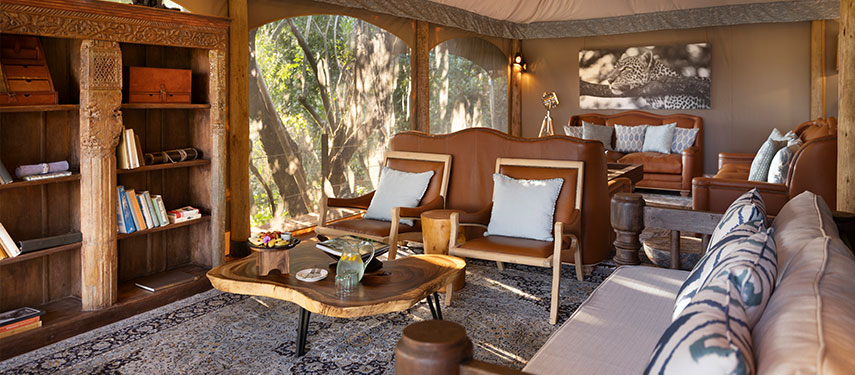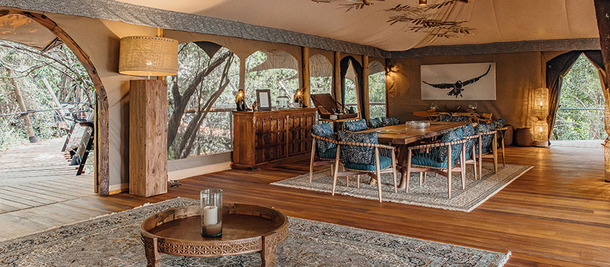 The camp features elegant tented suites elevated on wooden platforms, each offering breathtaking views of the surrounding bush. Decorated in a classic safari style with handcrafted furnishings and neutral tones, the suites also have private decks and en-suite bathrooms. The central mess tent includes a dining area, bar, and lounge, while an outdoor fire pit is perfect for storytelling under the stars. The camp operates on an eco-conscious ethos, prioritising sustainability and minimal environmental impact.