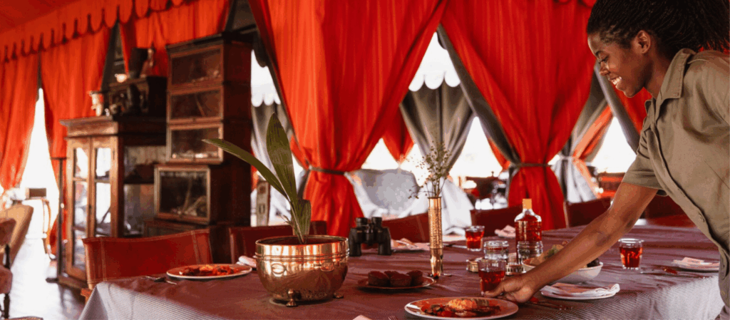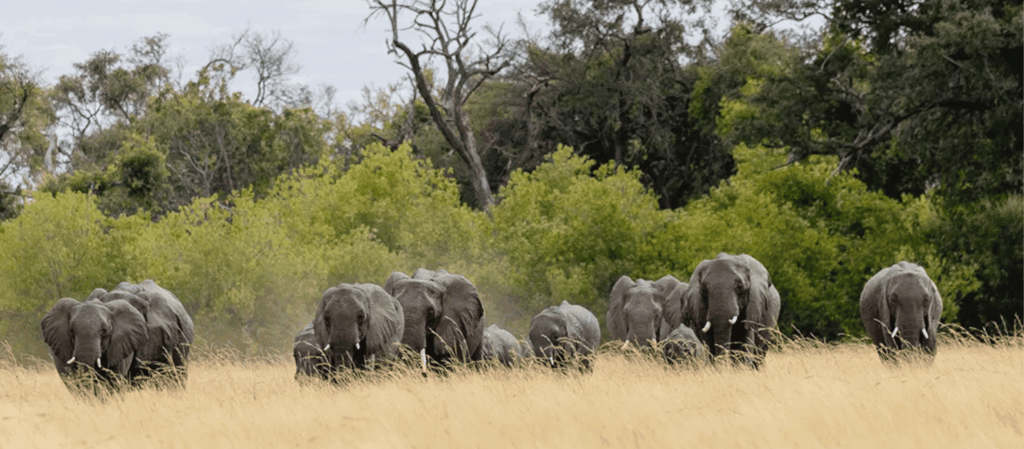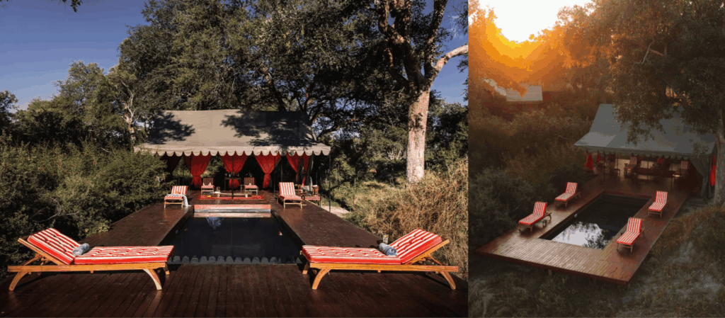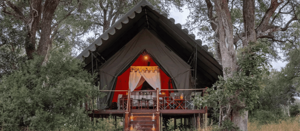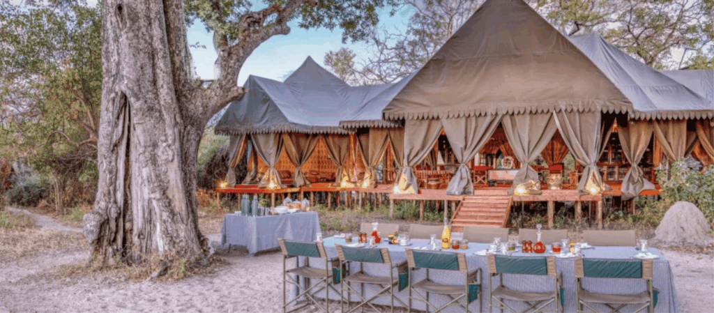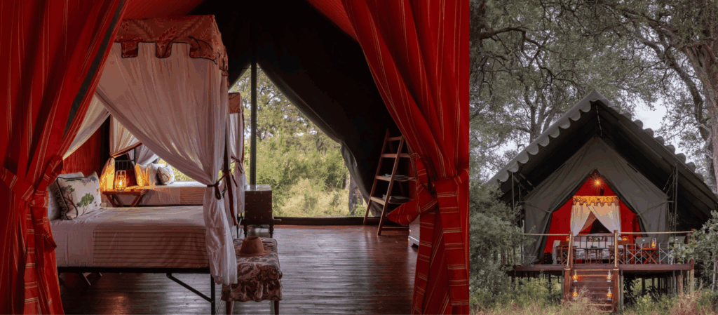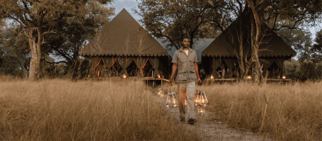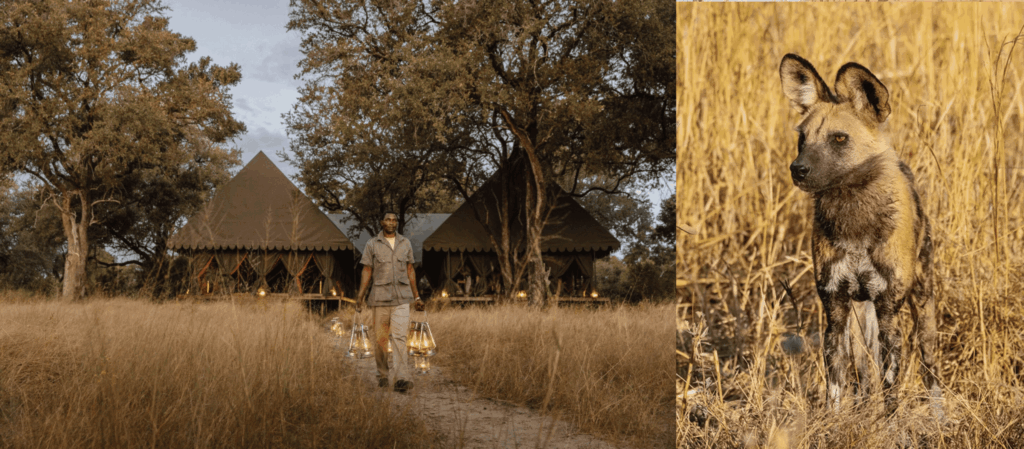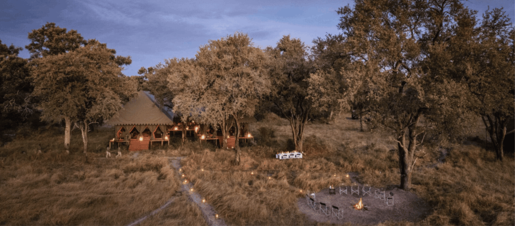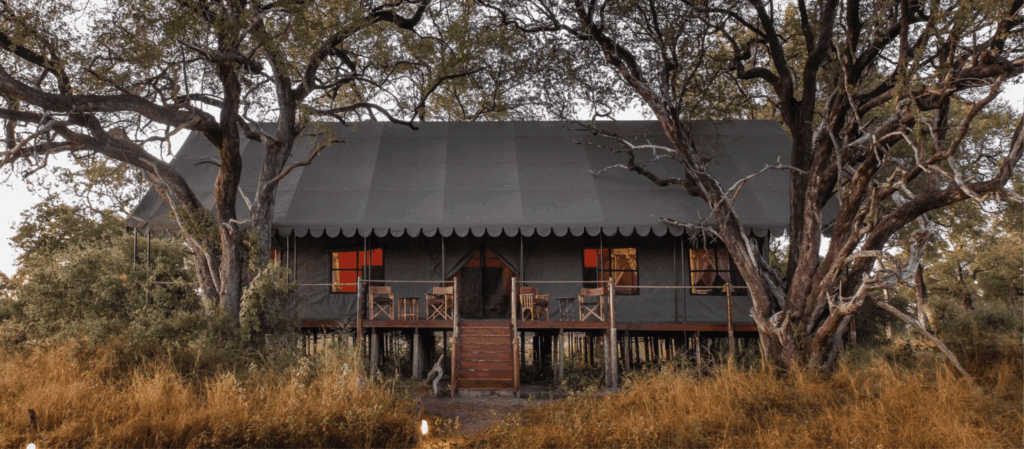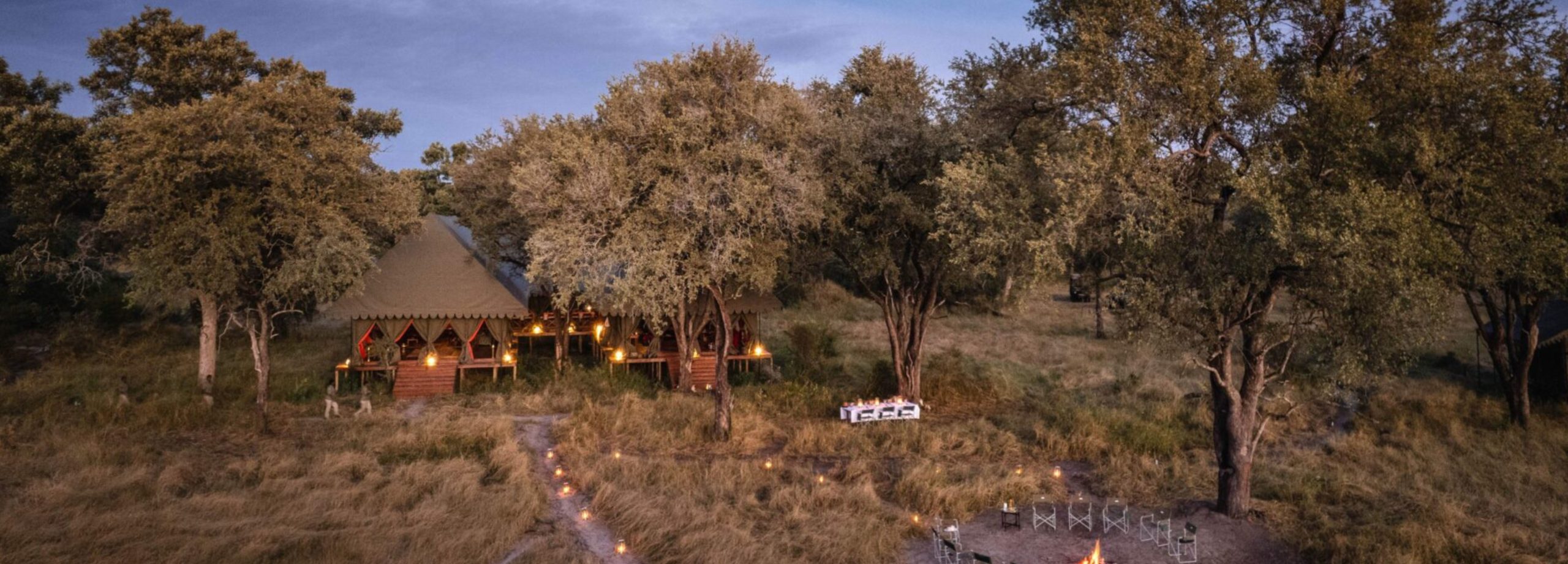 Designed in the classic East African style with a light touch, Mbamba offers just twelve spacious canvas tents, each elevated on timber decks beneath leadwood trees and cooled by Delta breezes and air conditioning. Four-poster beds, vintage touches, and woven rugs bring character, while en suite bathrooms and private verandas provide comfort and privacy between game drives. The camp’s shared areas include a central lounge and bar, two smaller relaxation areas, a plunge pool, and a fire pit for evening gatherings. Activities vary with the seasons — from mokoro and boating excursions when water levels are high, to game drives, bush walks and birding throughout the year. Scenic helicopter flights are also available for those seeking a broader perspective on this wild and little-known corner of the Delta.