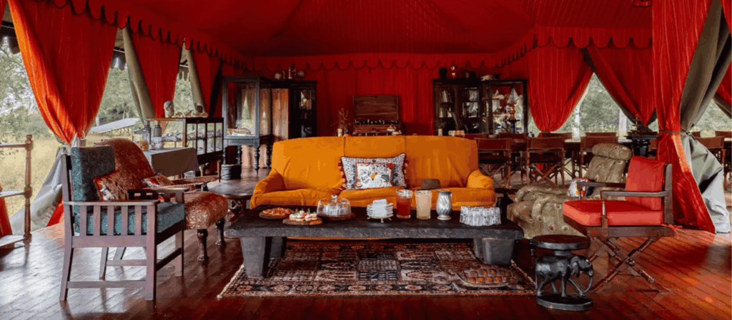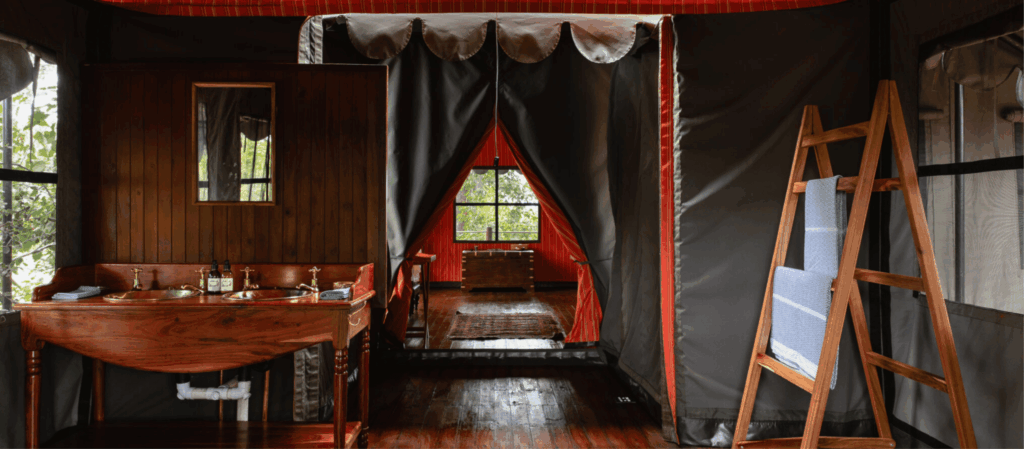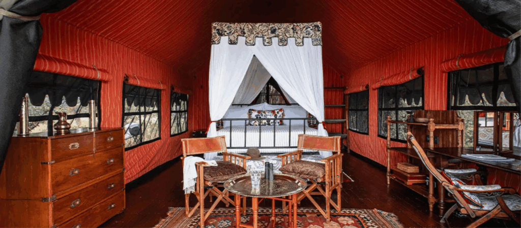 Elegant guest tent interior with a four-poster bed and vintage-style furnishings.