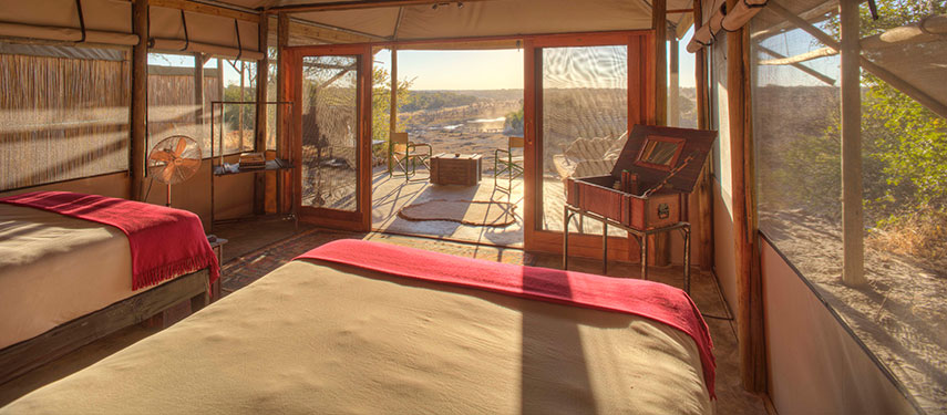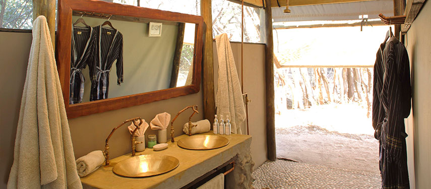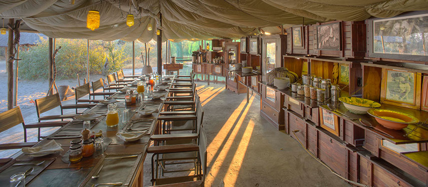 Meno A Kwena Tented Camp accommodates up to 25 guests in ten fully serviced en-suite canvas tents.  Tents are hidden amongst the natural vegetation for privacy, and situated in full view of the Boteti River where wildlife comes to drink from the dry Kalahari. There is a natural rock plunge pool for cooling off after a day on safari. Sand paths through the bush link the tents to Meno A Kwena’s main area. A large L-shaped marquee makes up the kitchen, bar, dining area and lounge, complete with well-stocked reference library and comfortable sofas scattered with cushions covered in bright eastern and kikoi fabrics.