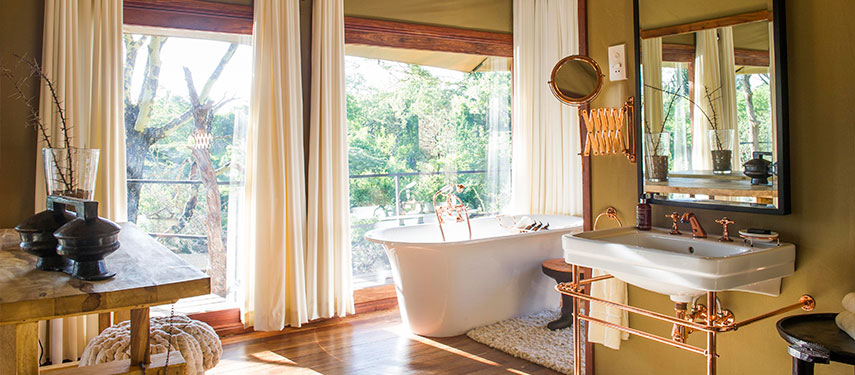 The eight double suites are all designed with an airy, open layout where each room flows into the next and beyond to the great outdoors. The interiors artfully blend rich textural fabrics, suede and timber with a contemporary colour scheme of cream, chocolate and charcoal. The en-suite bathrooms combine traditional canvas walls with copper fixtures, large soaking tubs with private outside showers while huge windows look out onto a private deck, the river below and into the vast African terrain. The main lodge boasts a grey slate-lined infinity pool overlooking three springs which draw a constant parade of wildlife.