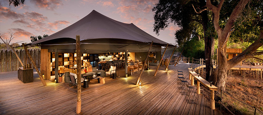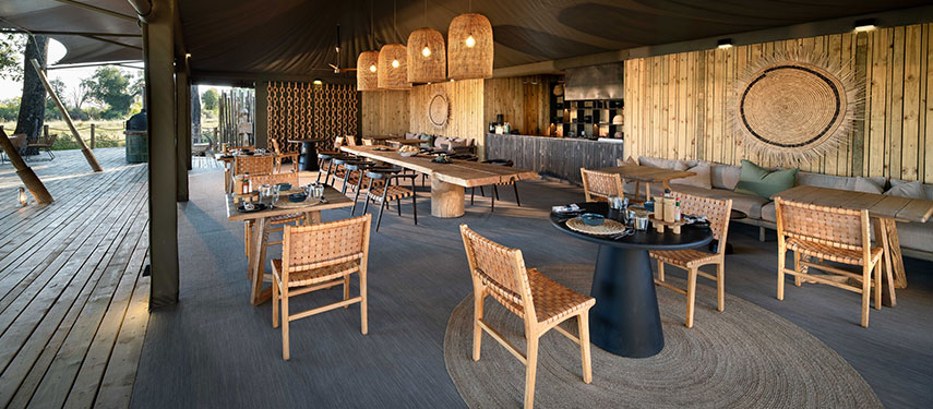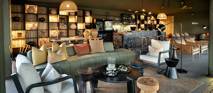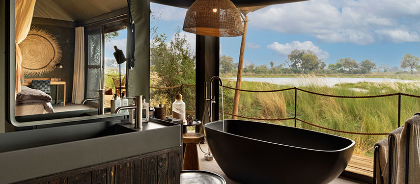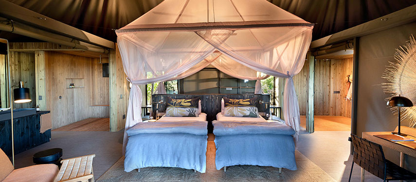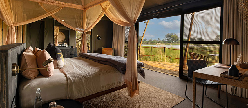 The camp is wonderfully quiet and exclusive, with just four tented guest suites resting on a raised wooden deck under the shady boughs of wild ebony trees. Each tent offers stunning views of the lagoon in front of it and a private plunge pool with a sunken sundeck for cooling off while watching the wildlife that comes into view. Interiors are styled with bold shapes, textures and contemporary African inspired design. For the hotter summer nights, each bed comes with its very own ‘over‐the‐bed’ cooling system, while in winter, there is a cosy fireplace to relax in front of, creating a romantic safari ambience.