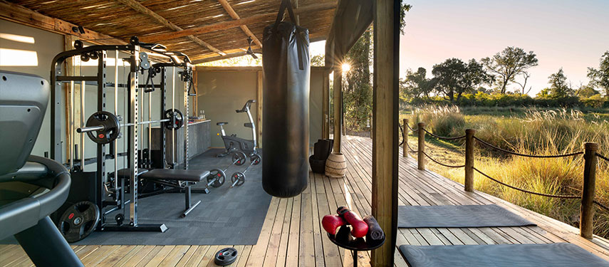 The main area sits peacefully in front of a glorious hippo‐filled lagoon, with a separate lounge and dining area to enjoy delicious dinners, connected by a wooden deck that extends onwards for stargazing around a crackling firepit at night. To the side, there is a separate library for resting and reading and an outdoor gym to exercise in, while surrounded by the wild.