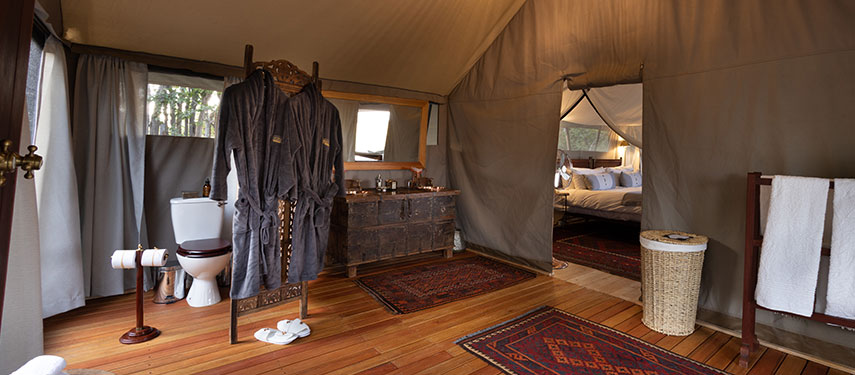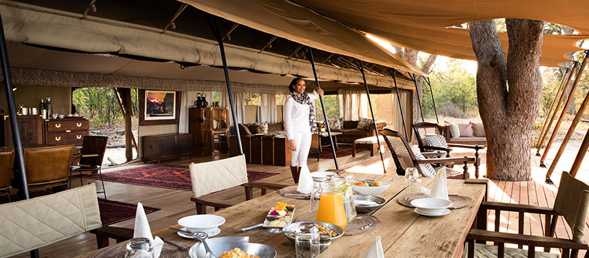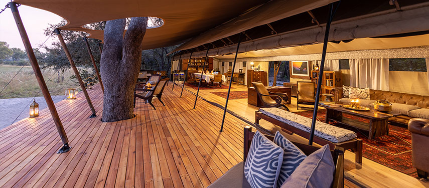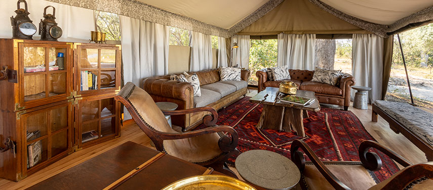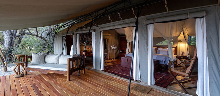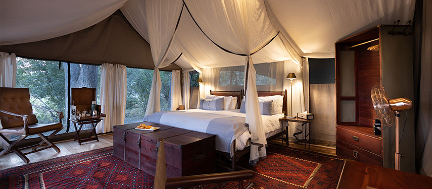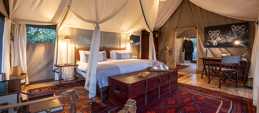 Designed in the style of a 1920s safari campaign, the camp blends vintage charm with modern comforts. The six tented suites are set on raised wooden decks with canvas walls that integrate with the surrounding wilderness. Each suite is furnished with handcrafted campaign-style furniture, woven rugs, and vintage trunks, creating a nostalgic yet elegant atmosphere. En-suite bathrooms feature eco-friendly bucket showers and flush toilets, while private verandas offer a tranquil space to watch wildlife gather at the spillway.