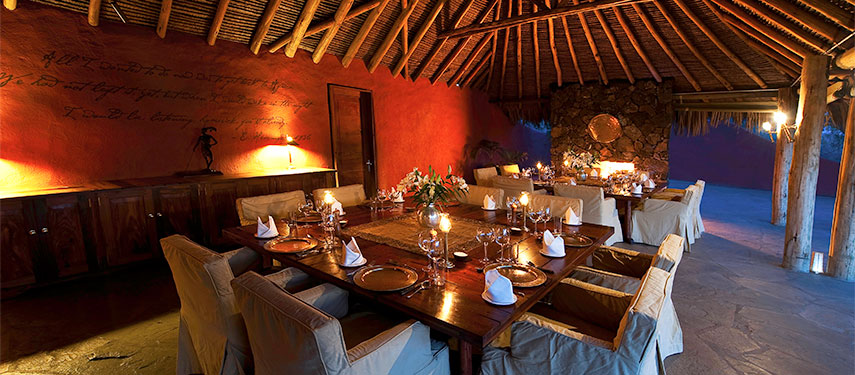 It is recognised as one of National Geographic’s ‘Unique Lodges of the World’ and sleeps just 20 guests in pure Relais & Chateaux luxury. No two suites or villas are the same but all have a lounge, verandah, indoor and outdoor showers, double washbasins, flush toilet and bath, and “star-bed”. The rooftop “star-bed” is accessed from the verandah via a winding stone staircase. This is a fabulous sleep-out option, with utter privacy and all the amenities of the suite just below. The décor is luxurious and opulent, but the lodge retains its sense of place in the bush. The breadth and depth of ol Donyo Lodge’s living and dining area is vast and upon entering one is immediately struck by its spaciousness, yet the sense of exclusive intimacy is not lost. The entire main area is set high on the hillside, and opens completely to the plains below, with Mount Kilimanjaro ever present in the distance. The use of stone, thatch and wood make for a very tactile, immersive experience.