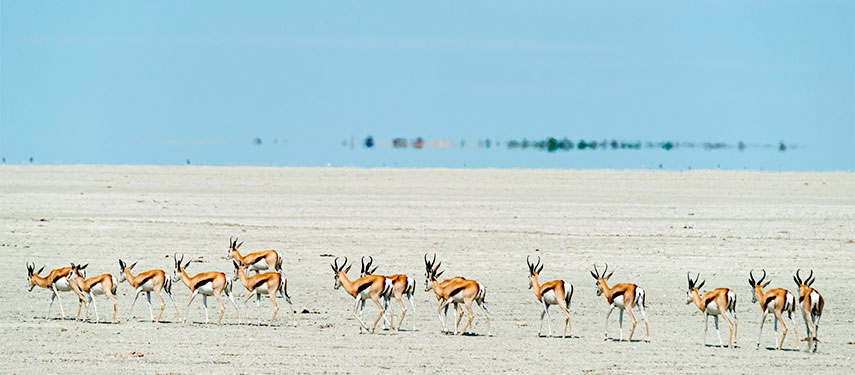 Africa’s largest saltpan, Etosha, is the result of a geological shift that dramatically changed the course of the Kunene River, away from where the pans are today. The pans, 120km across and 55km from north to south, were formerly an ancient lake. Today the Pan is mostly bone dry, the stark, parched white surface giving the Pan its Herero name ‘Great White Place’.