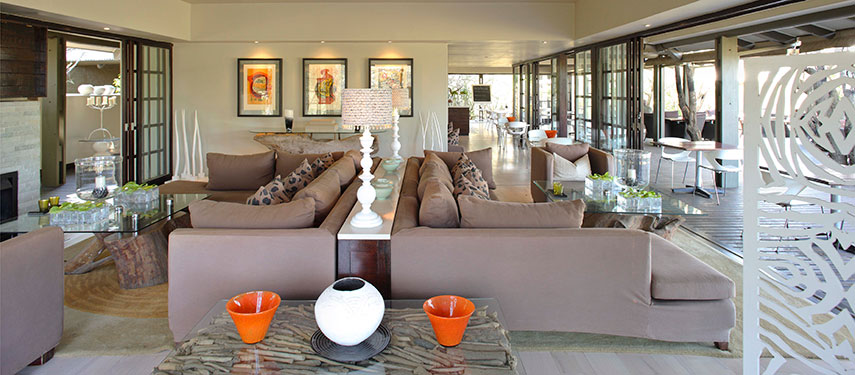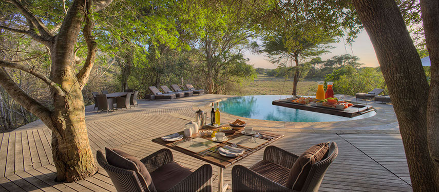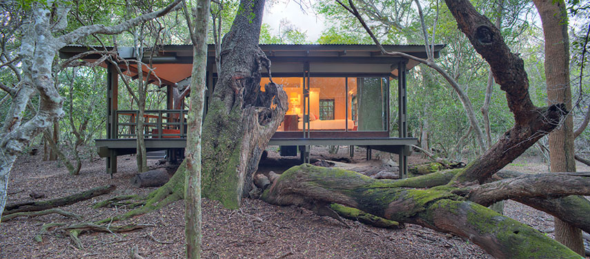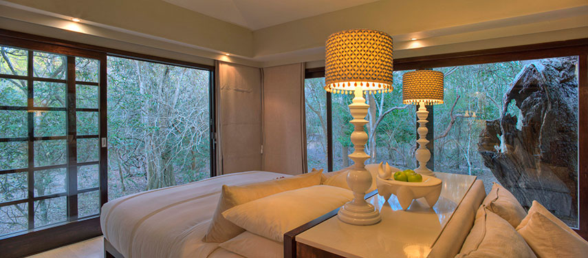 The 16 suites are built on stilts and appear to float between the forest floor and the towering torchwood trees. Inventively designed in a style affectionately known as Zulu Zen, each handcrafted, glass-encased suite boasts a minimalist flair that incorporates high-gloss wooden floors, richly tactile fabrics and brightly accented Zulu artefacts. The suites have luxurious en-suites and viewing decks. The lodge’s sparkling rim-flow swimming pool, as well as expansive decks in its seating area, look out onto panoramic views of an open plain. A traditional African boma is enclosed with a wooden fence and offers lantern-lit open-air dining beneath a canvas of stars.