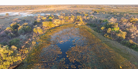 The Okavango Delta is one of the last remaining unspoiled wilderness areas in Africa. The Delta is fed by the floodwaters of Central Africa and covers an area of some 16,000 square kilometers. These waters fan out into the Okavango Delta forming a wetland system of beautiful palm‐fringed channels, lagoons and islands that support a wealth of fauna and flora alike.