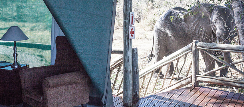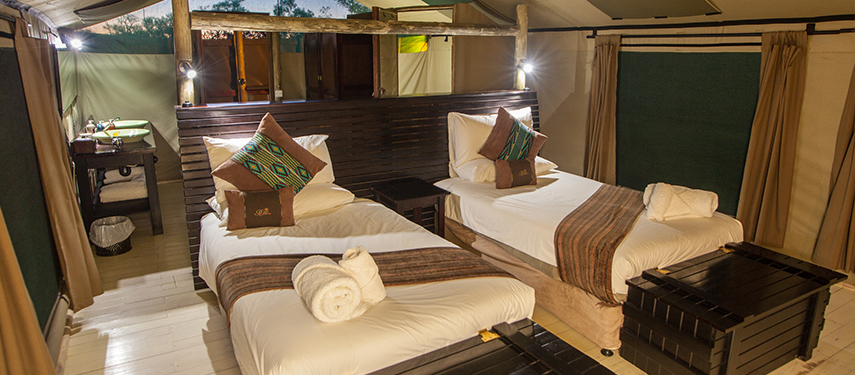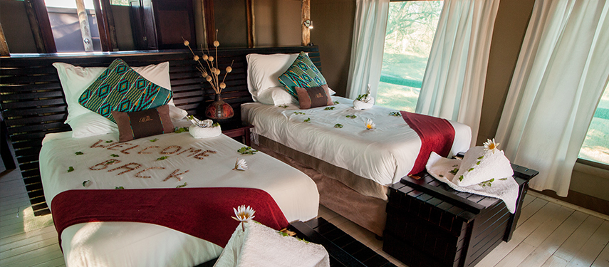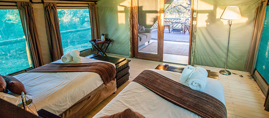 Nine traditional safari style, luxury en suite tents are uniquely positioned under the shade of the surrounding trees Pom Pom lagoon. The main lounge and dining area are under thatch and the bar overlooks the swimming pool ‐ the perfect location to enjoy a relaxing afternoon during the heat of the day.