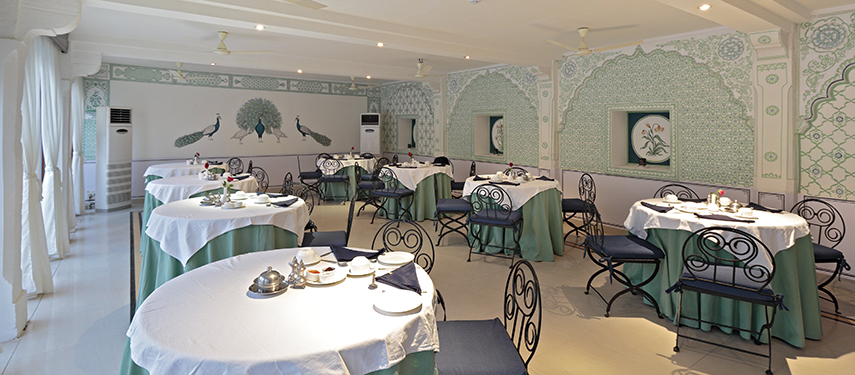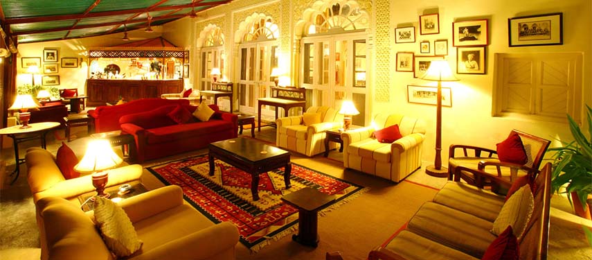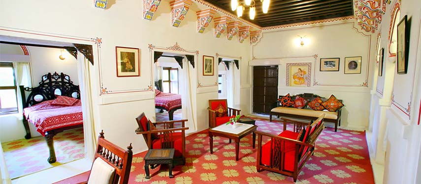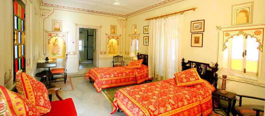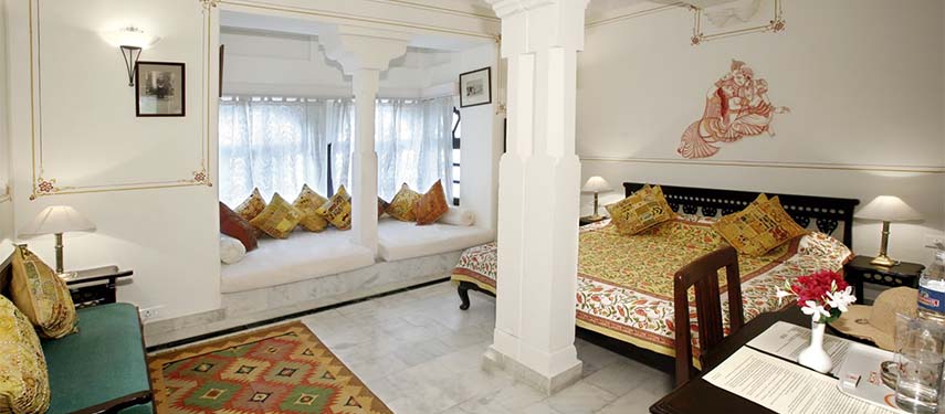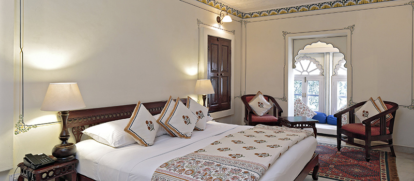 Rooms are scattered around the premises either facing onto the gardens or overlooking the lake. The rooms are all unique varying in shape and size and have been nicely decorated in traditional Rajasthani fabrics, varied colour themes and frescoes.