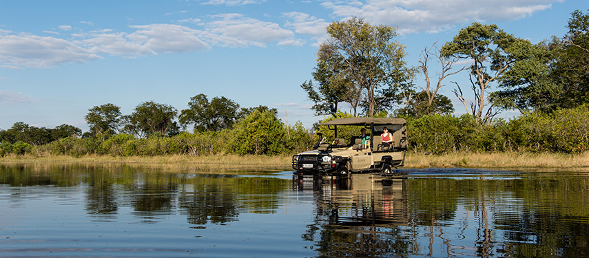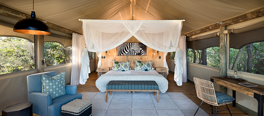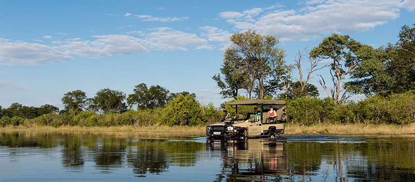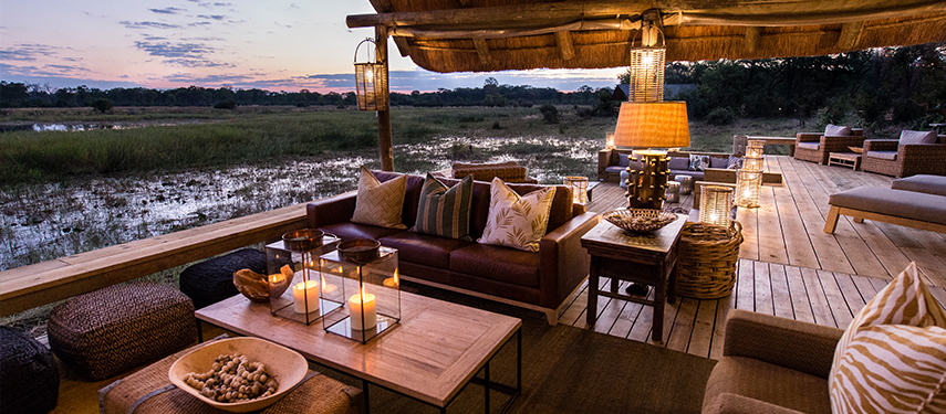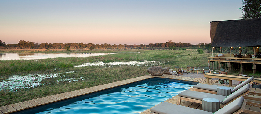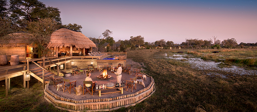 A wildlife rich lagoon sits in front of Sable Alley in Botswana