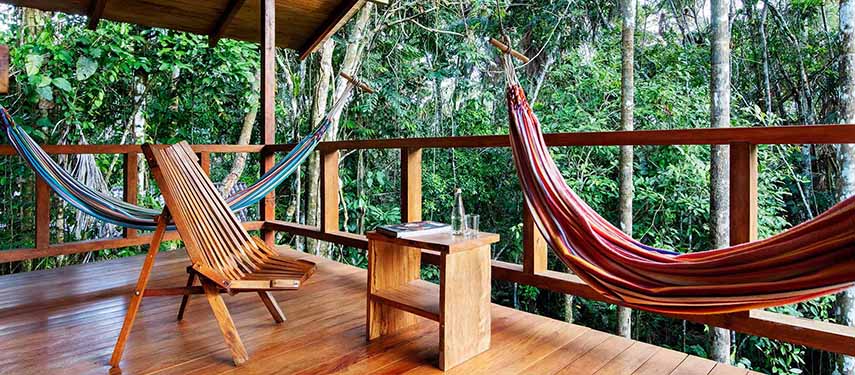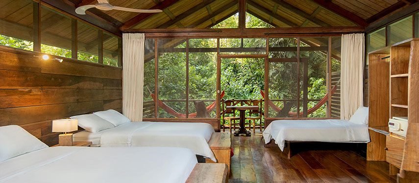 The lodgings at Sacha have been carefully designed to offer comfort and to preserve the environment and rainforest ambience. All of the cabins, with high thatched roofs and private shaded terraces, are constructed of traditional materials and are well concealed in the lush surroundings. Each of the twenty-six rooms is screened against insects and each cabin has hammocks overlooking the jungle where you can relax between activities and, with luck, see the resident toucans, agoutis and monkeys.