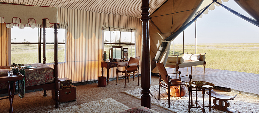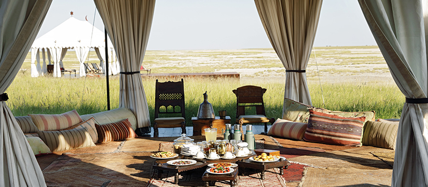 San Camp is a small camp of palm trees and elegant white Ottoman style tents that overlook the ethereal vastness of the Kalahari Desert. Accommodating just twelve guests it follows the classic 1920’s safari set up – think Persian rugs, cool cotton sheets and mahogany furniture in striking contrast with the ruggedness emptiness of the surrounding wilderness. Each of the tents is luxuriously furnished and each enjoys a private en suite bathroom with hot running water, polished copper basins and flush toilets. A private verandah is the perfect spot to watch the sun set, as the camp is softly lit by lanterns.