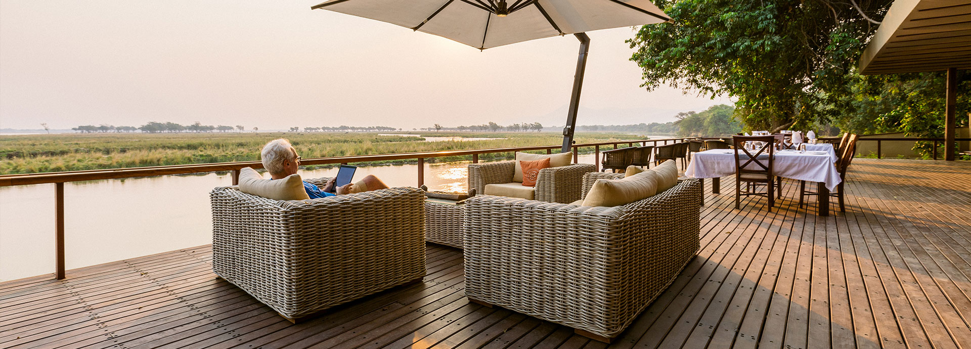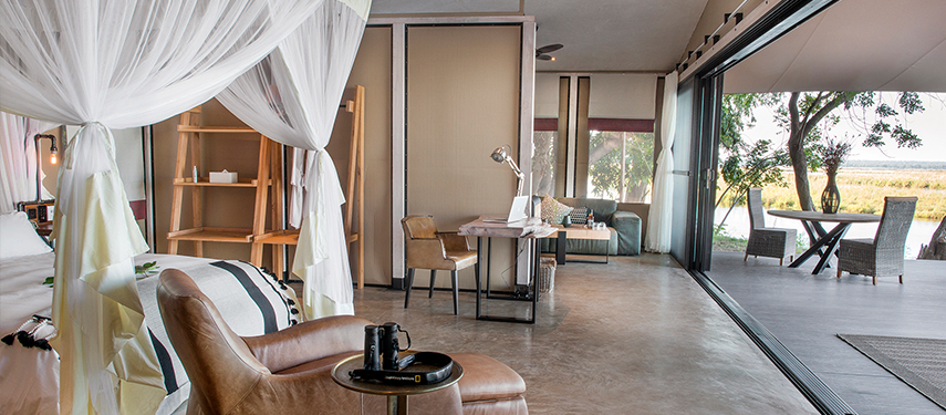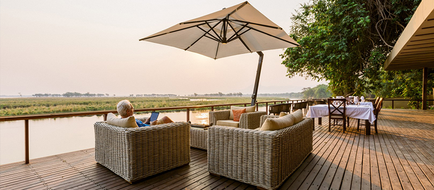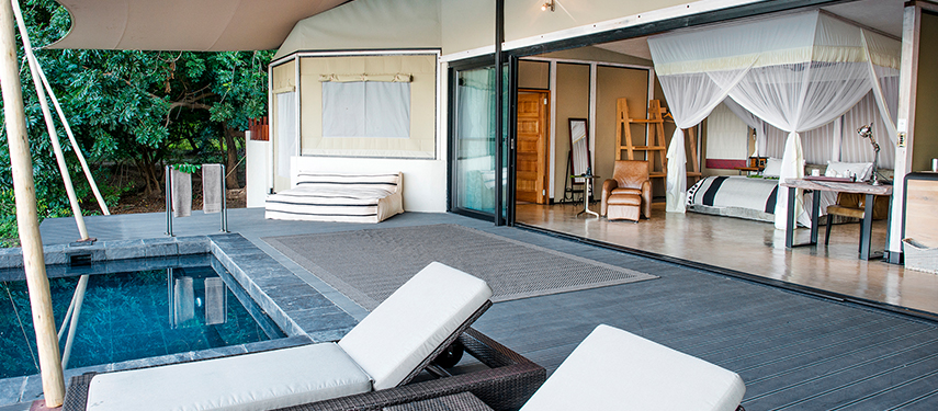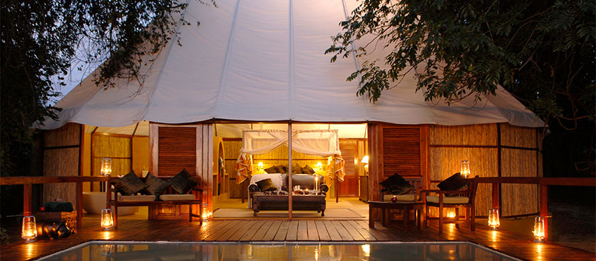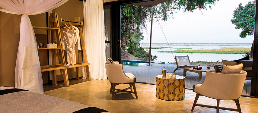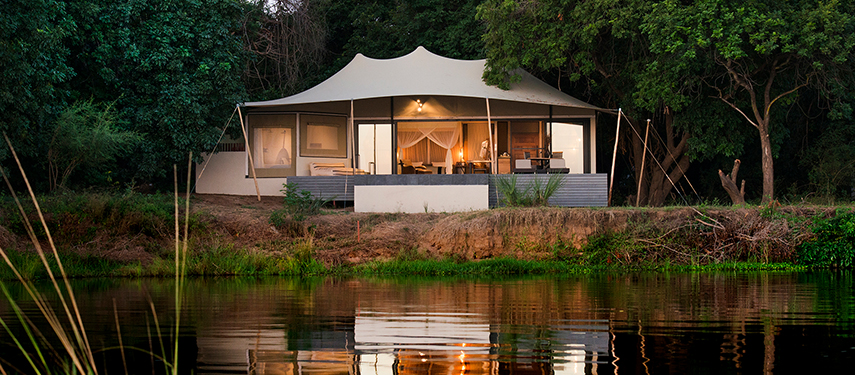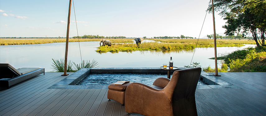 The camp offers 5 ‘Signature Tents’, two ‘Honeymoon Suites’ and the stunning ‘Kigelia House’. Each tent has its own personal Muchinda (butler) to attend to your every whim. The main areas of the lodge stretch along the river bank and the view from the glamorous infinity pool is stunning.