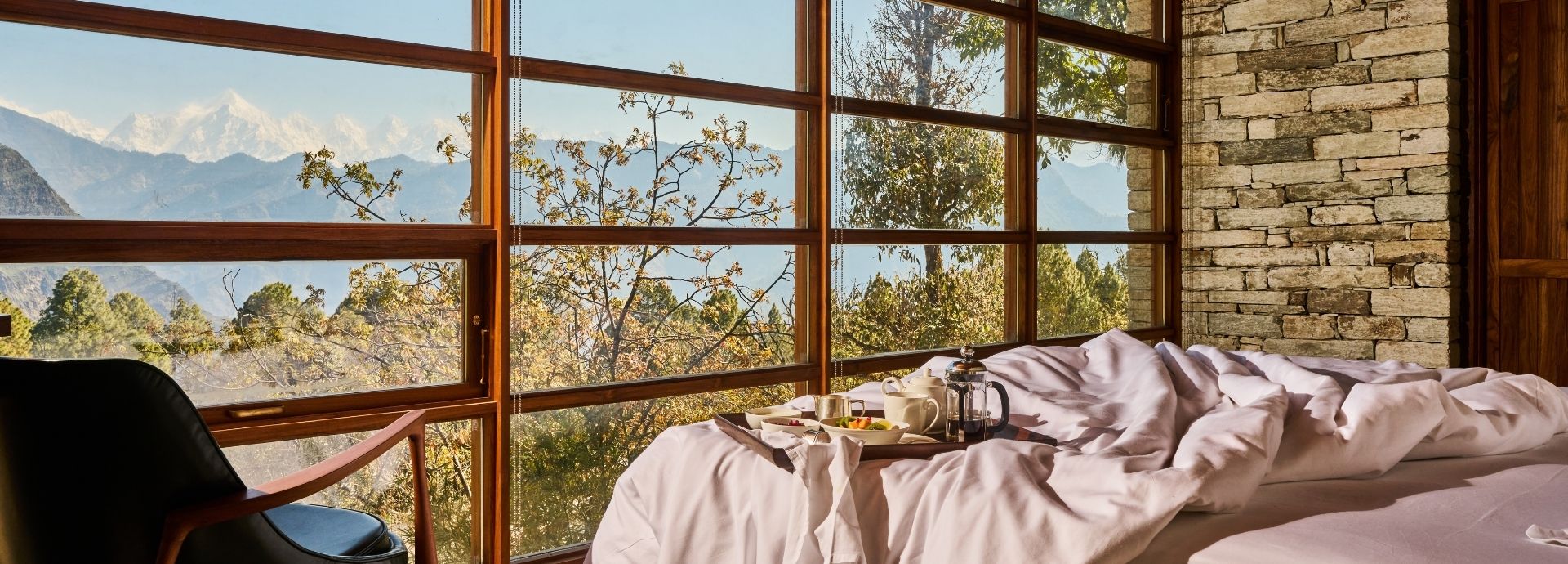 Set against the dramatic backdrop of snow-capped peaks including Nanda Devi and the Panchachuli range, Shakti Prana blends indigenous craftsmanship with modern design. Accessible only after a scenic mountain drive and a gentle walk along forest paths, Shakti Prana offers an extraordinary sense of arrival that prepares you for an immersive journey into nature, culture and tranquillity.