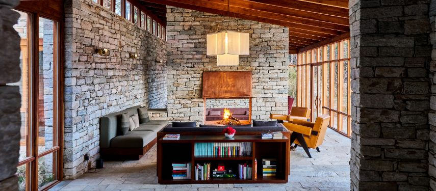 The lodge comprises seven beautifully crafted stone, glass and timber cabins, including a generous two-bedroom suite, each with soaring windows framing uninterrupted mountain panoramas and a private verandah to savour sunrise in silence. Interiors are warm and refined with open fires, cosy wood stoves, plush handcrafted textiles and luxurious ensuites clad in natural materials. A central lodge houses elegant living spaces and relaxed dining areas where organic meals — from regional Indian specialities to international fare — are served with produce from the onsite herb and vegetable gardens, all complemented by thoughtful service that feels personal yet unobtrusive.
