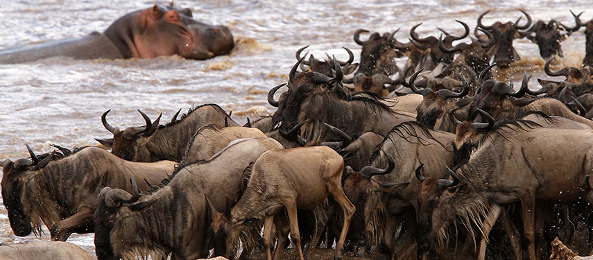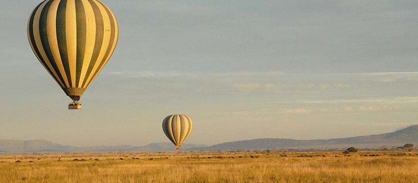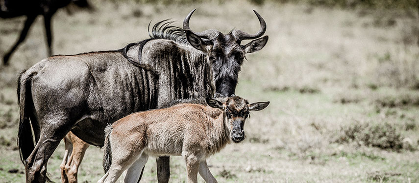 Wildebeest from the great migration running across endless plains at Alex Walker's Serengeti Camps