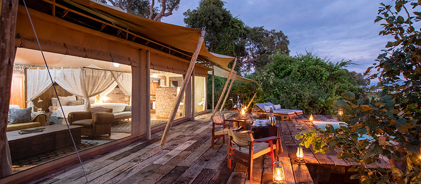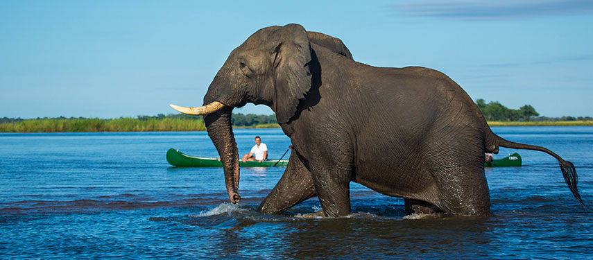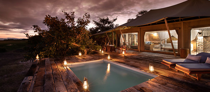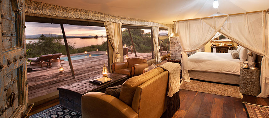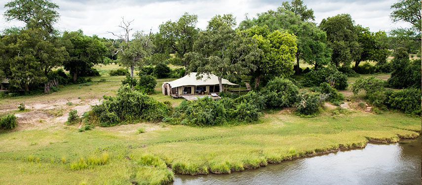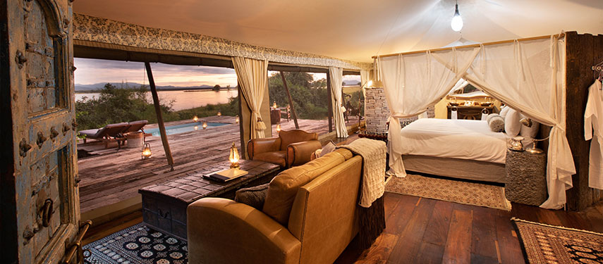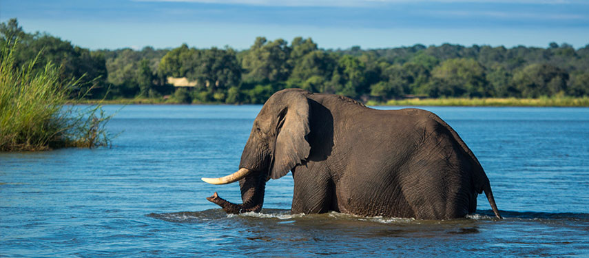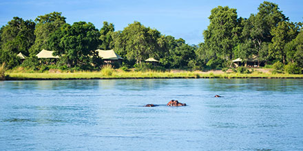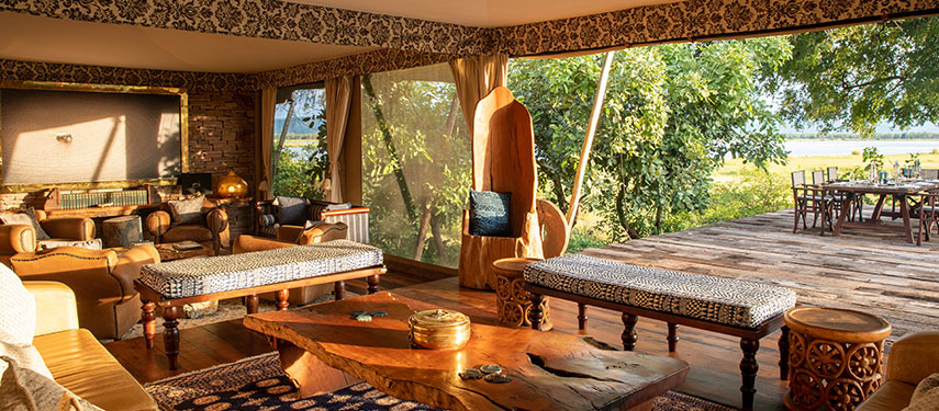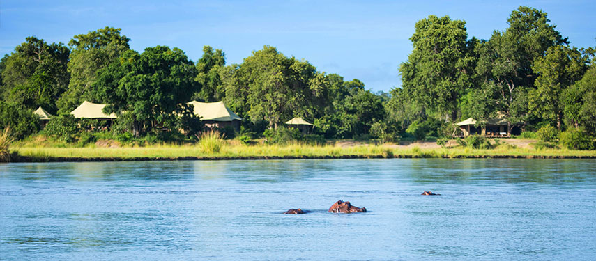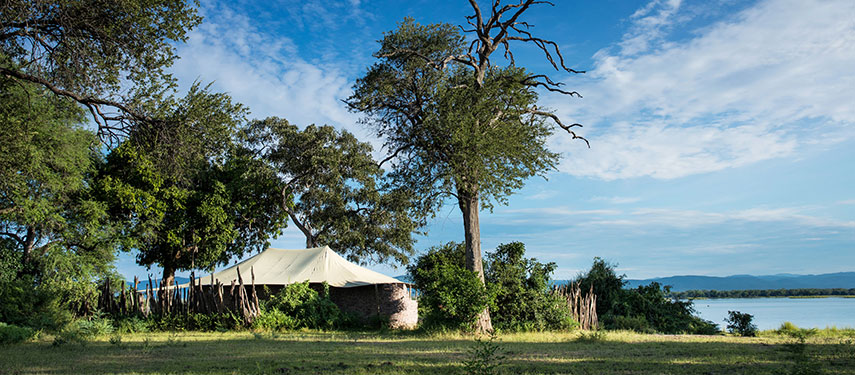 Tembo Plains Camp is tucked away into a thick riverine forest on the edge of the Zambezi River, in the private 128,000‐hectare Sapi Private Reserve, East of Zimbabwe’s Mana Pools National Park.