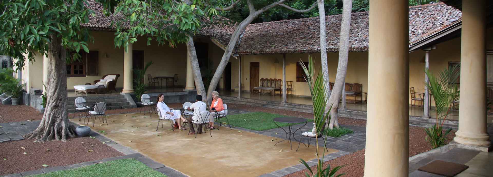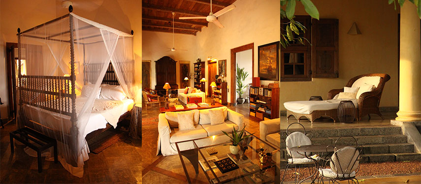 The four exquisite suites are arranged in a horseshoe formation in each corner of the original house. All open onto the extensive plateau lawn that features a 200-year-old Tamarind tree. Verandas stretch around the house while a comfortable sitting room and a library extension is located inside. There is even a small pantry kitchen where guests can make their own cocktails or cups of tea. The floors throughout are either polished hardwood or cool tiles while four-poster canopy beds, antique bookshelves, cabinets, dressing tables and writing desks stand atop them. Elegant silk drapes cover antique window and door frames.