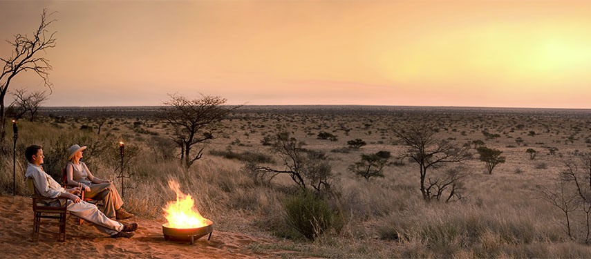 Enjoy unobstructed views of the vast Kalahari plains by the campfire as the sun sets at Tswalu