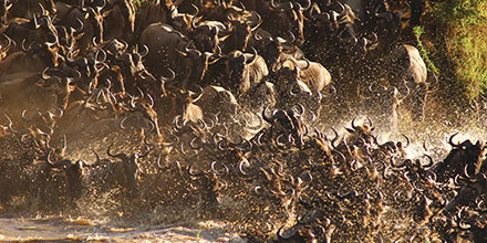 A herd of wildebeest on the Serengeti Silhouetted by the sunset