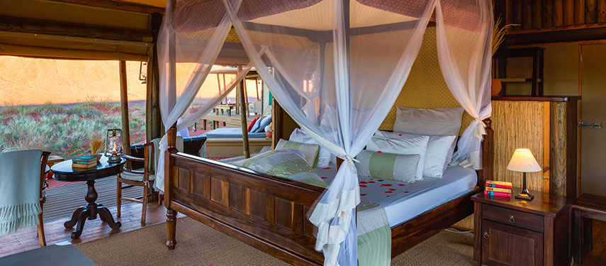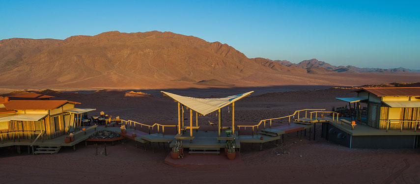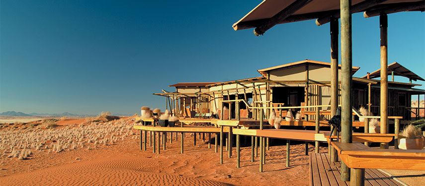 Built on stilts, and constructed largely from wood, Wolwedans Dune Lodge consists of a main camp, 10 chalets and the Mountain View Suite. With canvas or open sides, untreated wooden floors, muted walls, exposed beams, beautiful leather armchairs, handwoven rugs and a light that is either lantern, candle or natural, the camp is simply stunning. The service is excellent & the food superb.